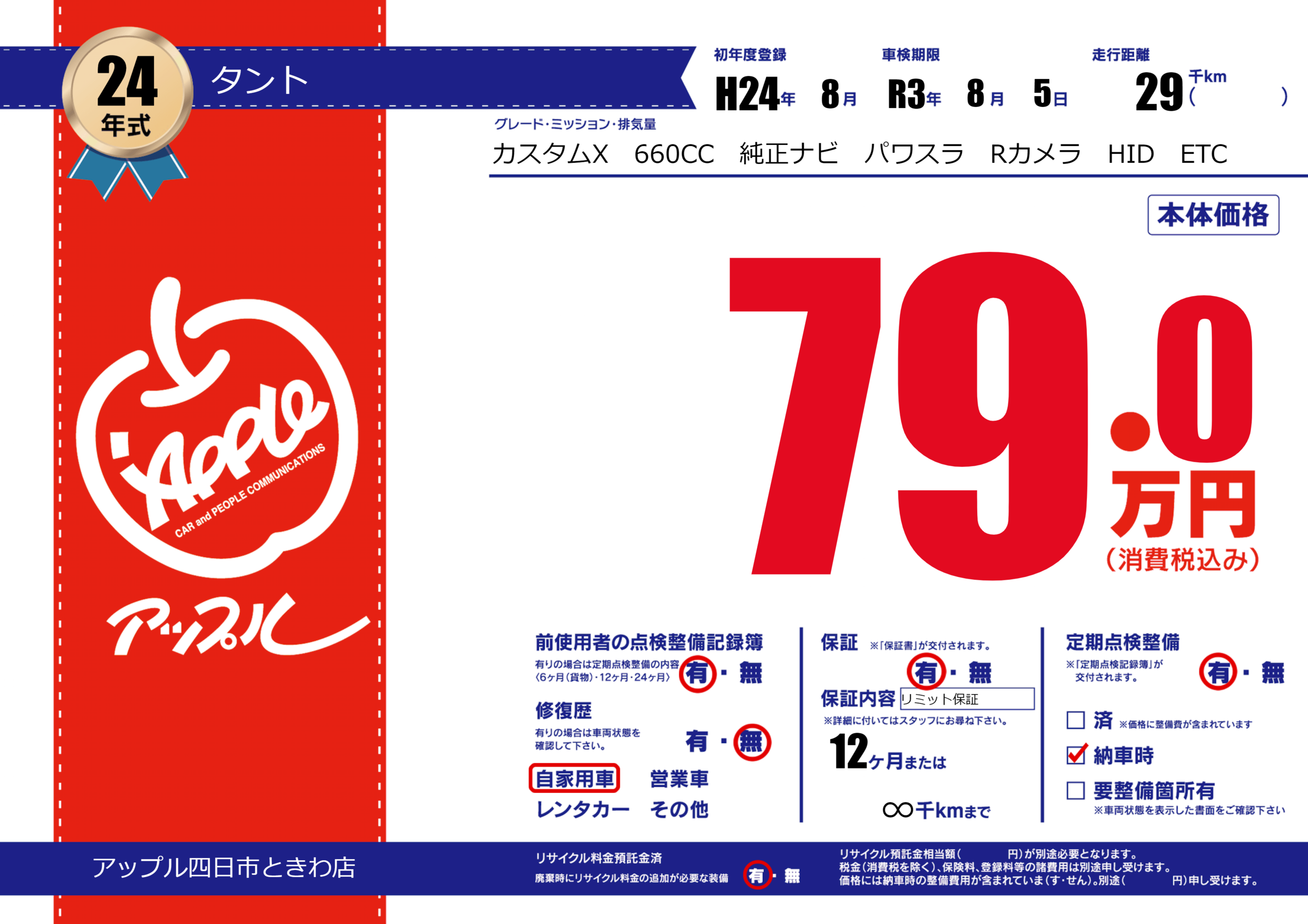 | 走行キロ | 2.9万km | 初年度登録 | H24年8月 |