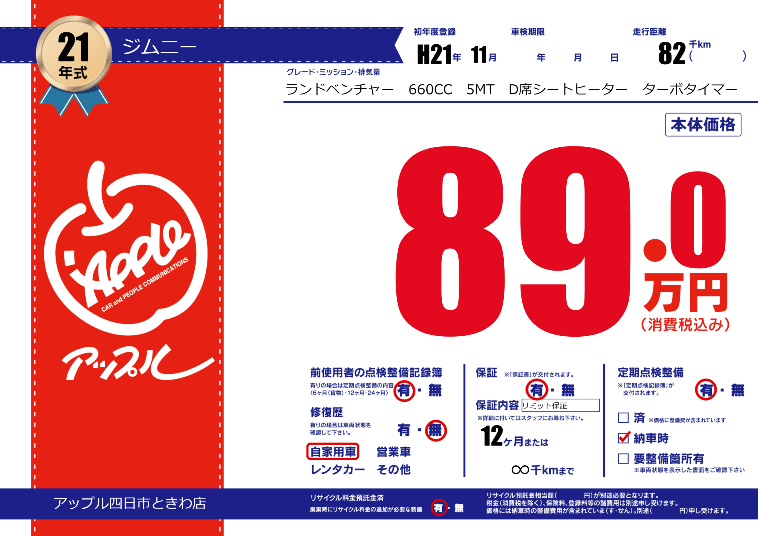 | 車名 | ジムニー | グレード ミッション 排気量 |