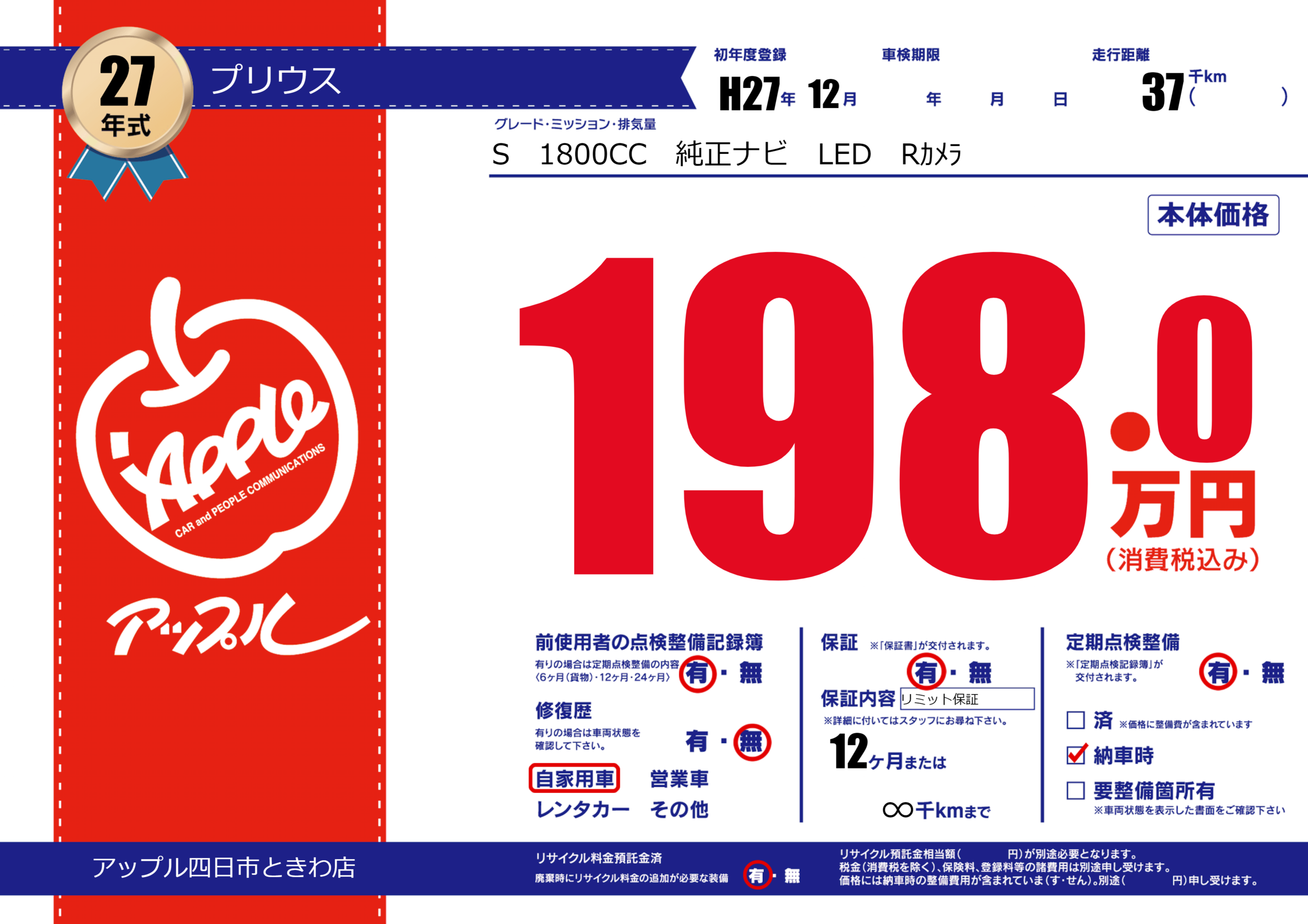 | 車名 | プリウス | グレード ミッション 排気量 |