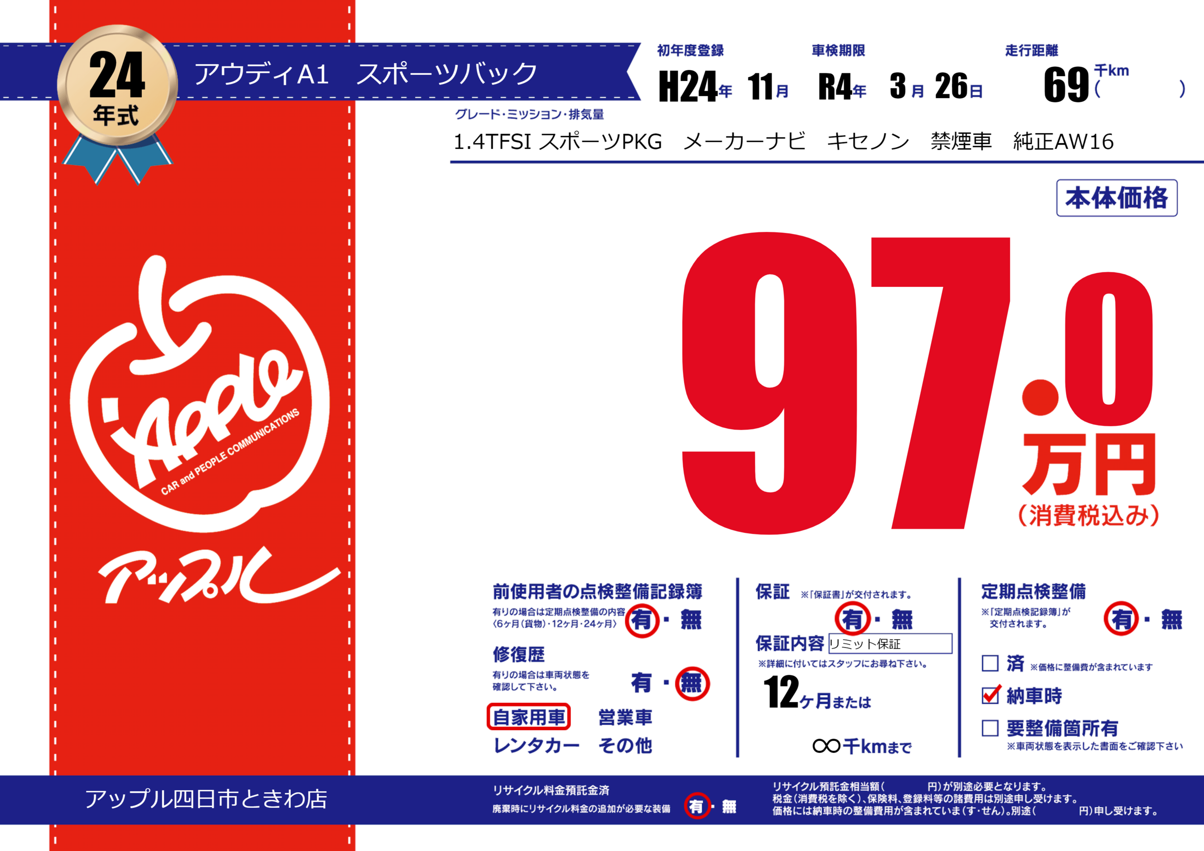 | 車名 | アウディA1 スポーツバック | グレード ミッション 排気量 |