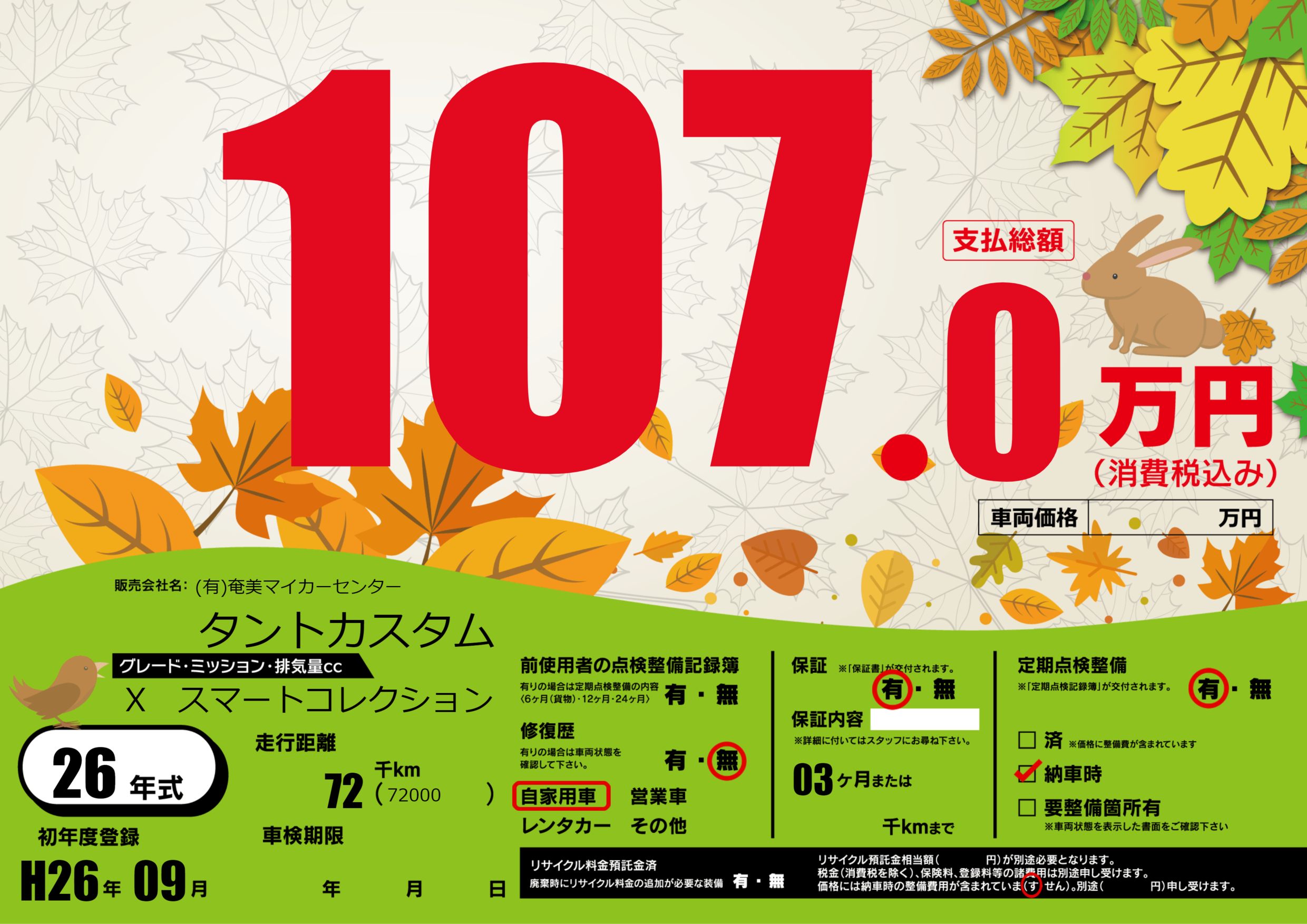 | 車名 | タントカスタム | グレード ミッション 排気量 |