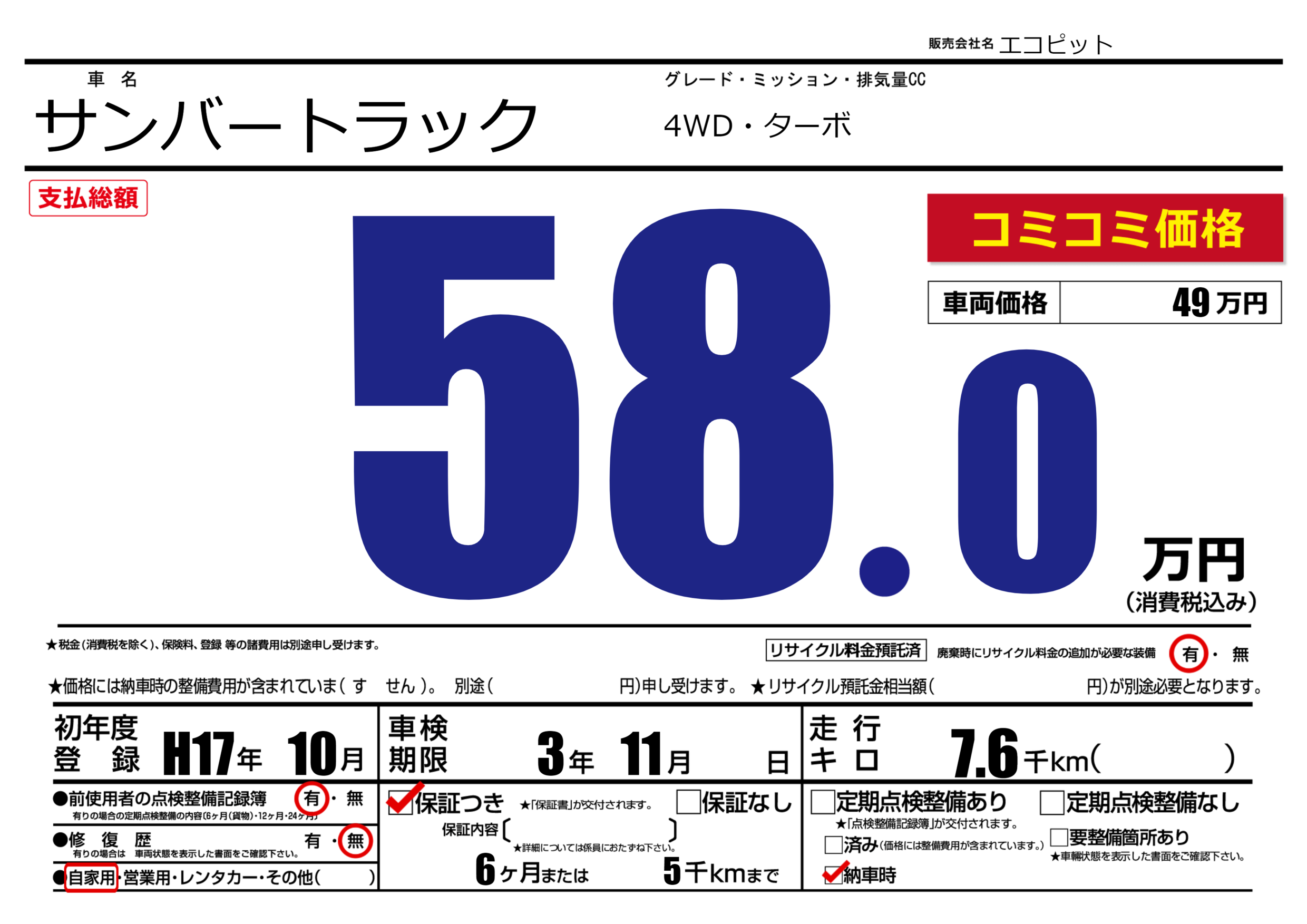 保証付き 保証内容(---) 6ヶ月または(5)千kmまで |