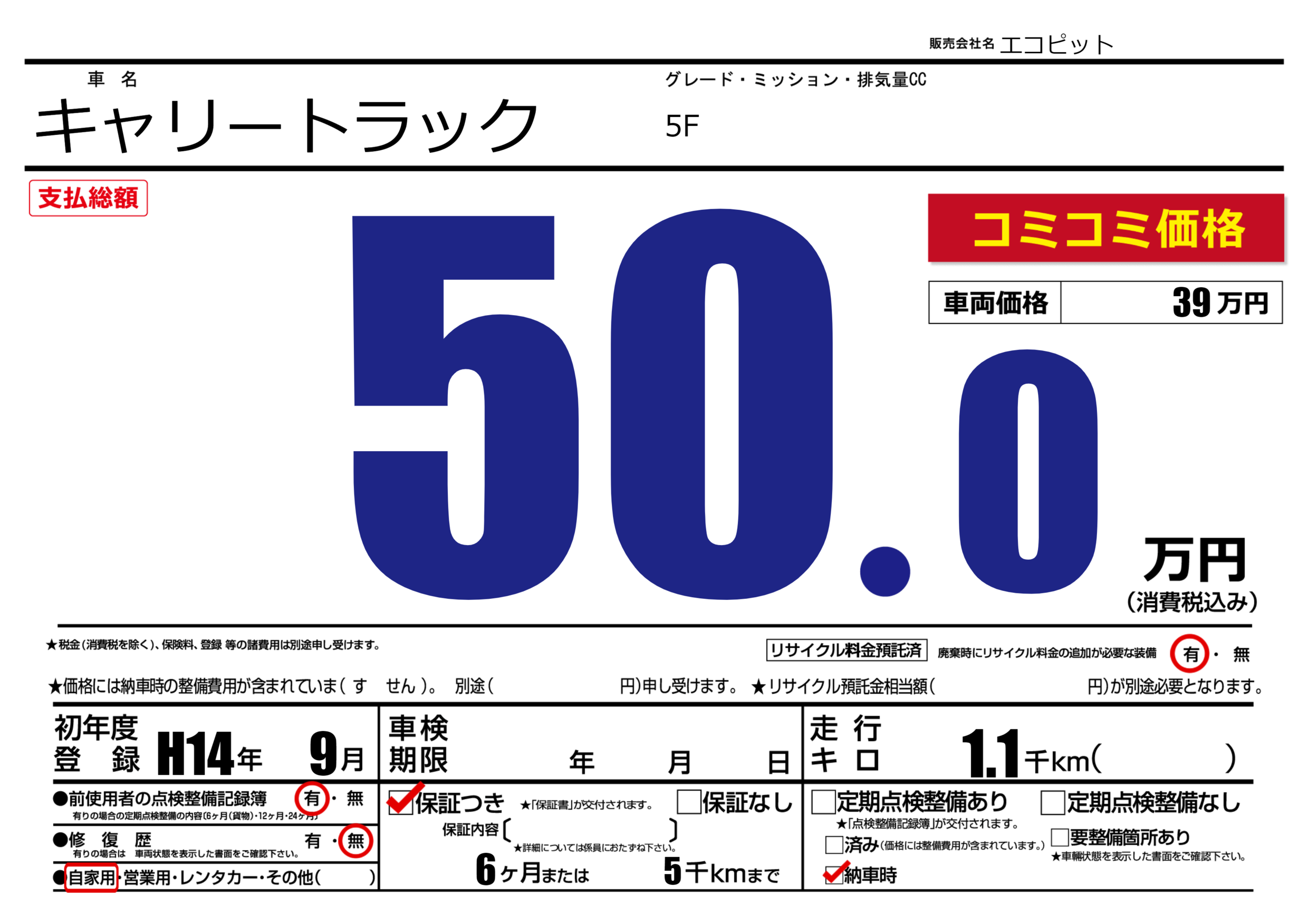 保証付き 保証内容(---) 6ヶ月または(5)千kmまで |
