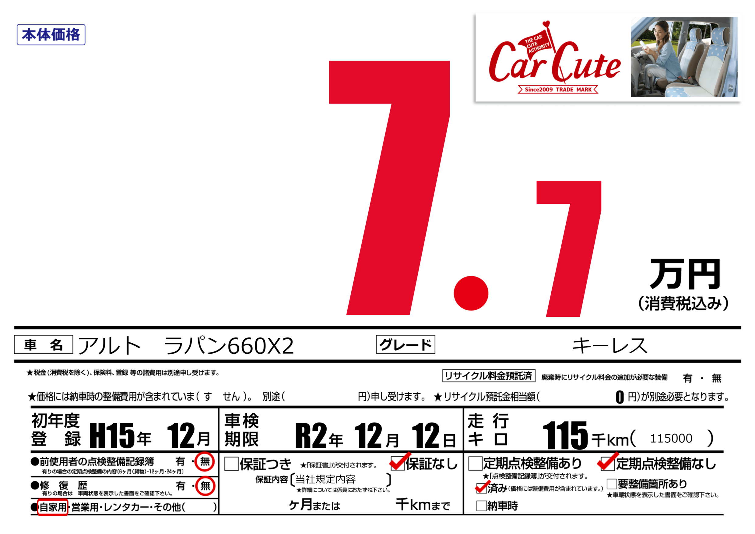 | 車名 | アルト ラパン660X2 | グレード ミッション 排気量 |