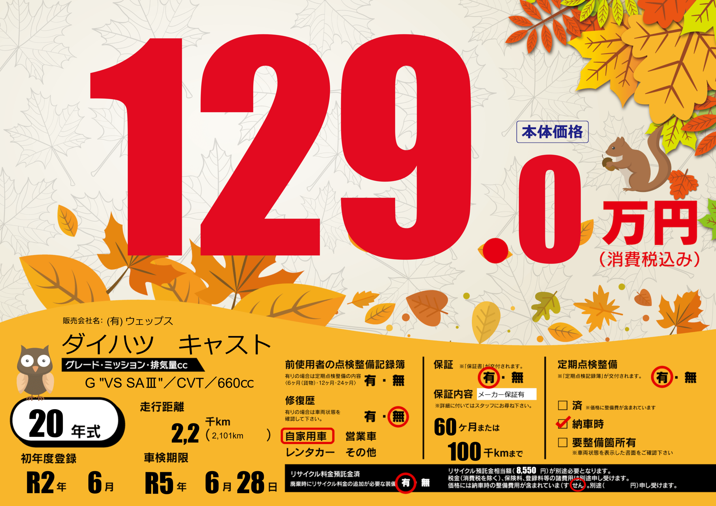 | 車名 | ダイハツ キャスト | グレード ミッション 排気量 |