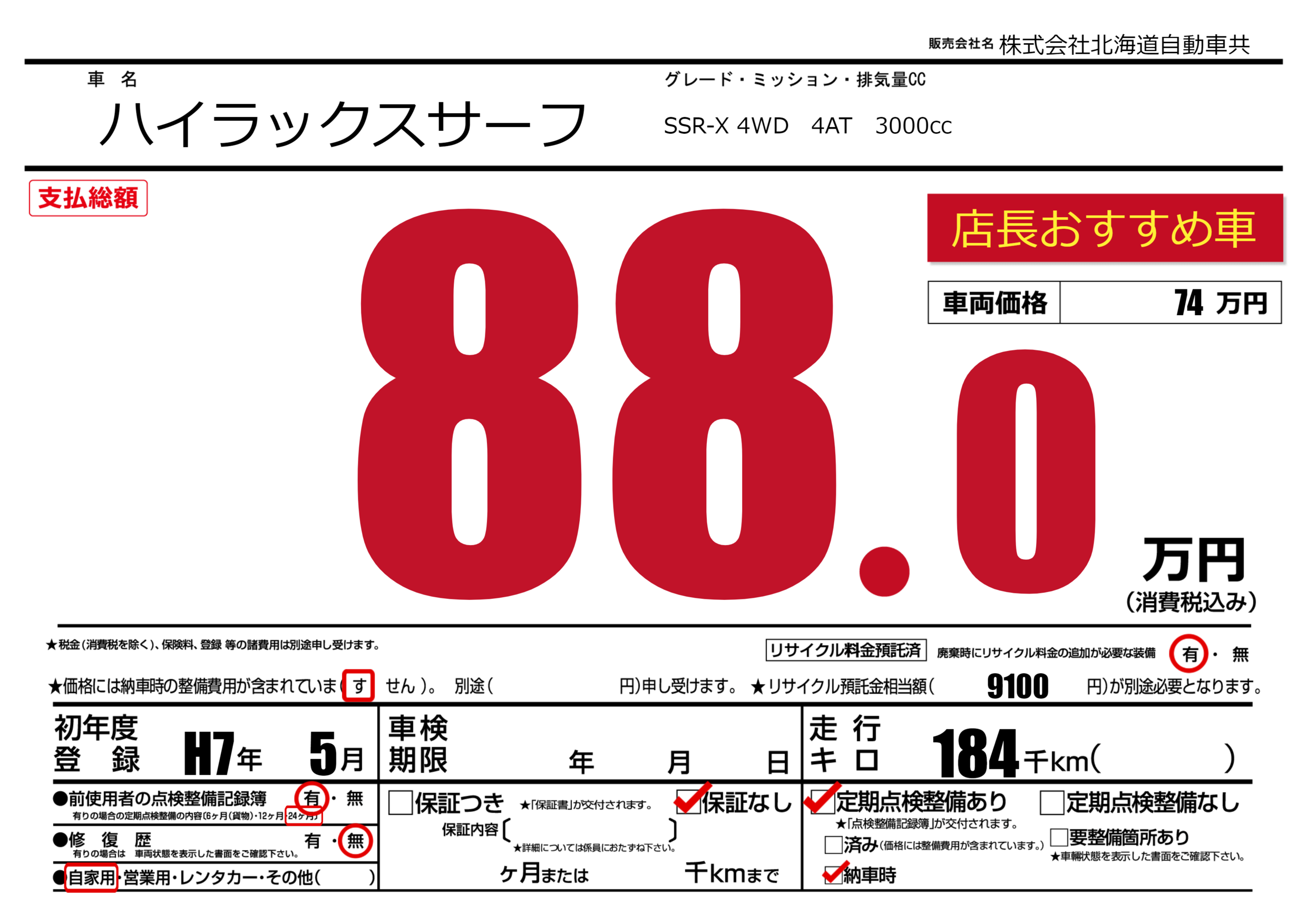 | 車名 | ハイラックスサーフ | グレード ミッション 排気量 |