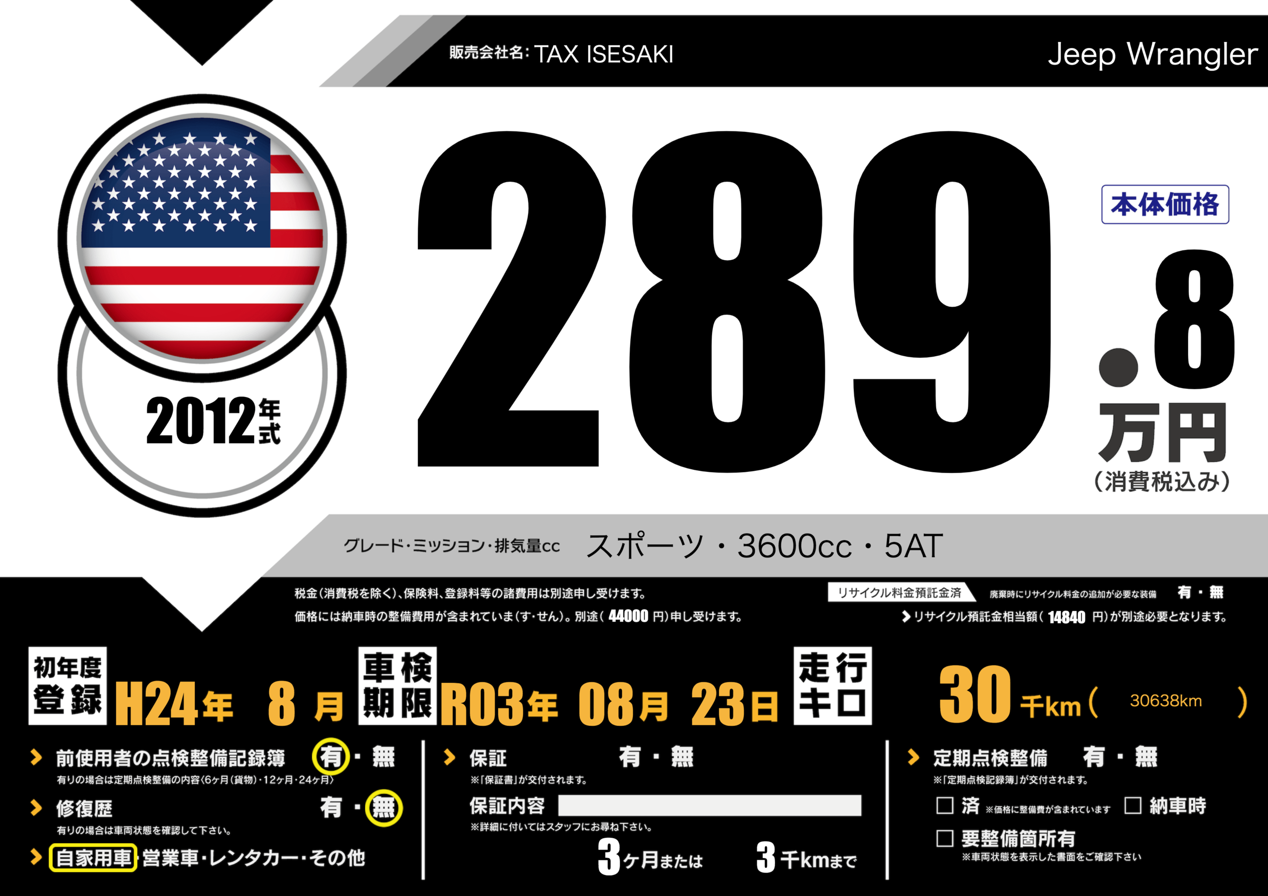 | 車名 | Jeep Wrangler | グレード ミッション 排気量 |