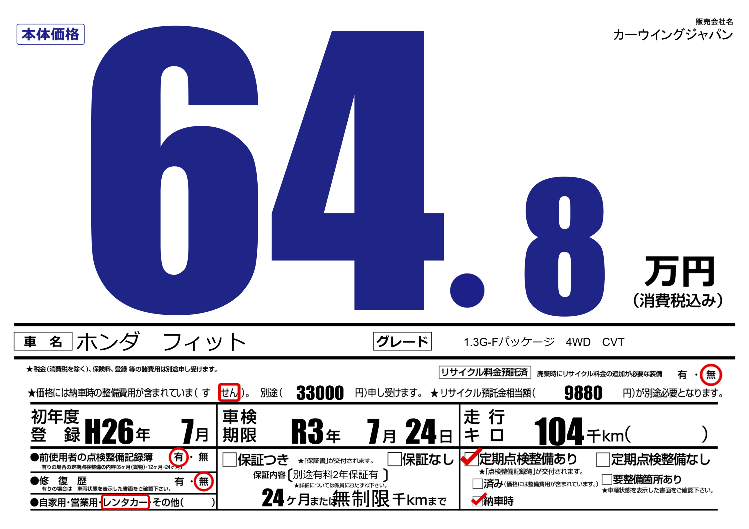 | 車名 | ホンダ フィット | グレード ミッション 排気量 |