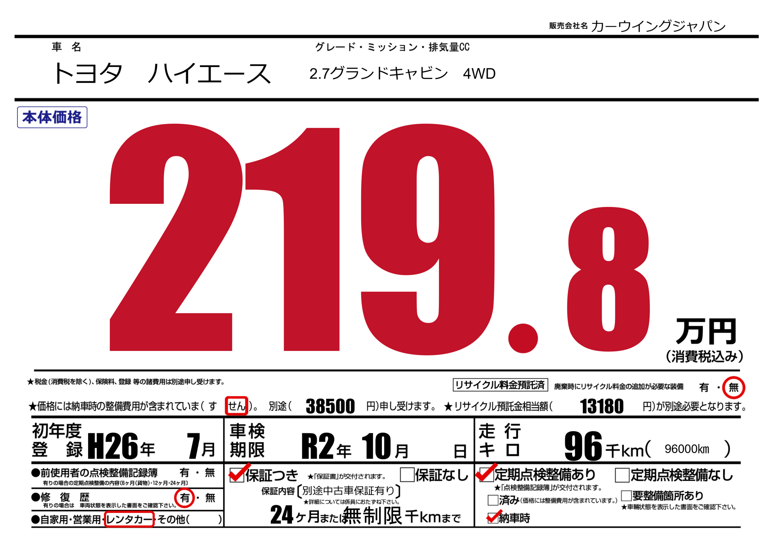 | 車名 | トヨタ ハイエース | グレード ミッション 排気量 |