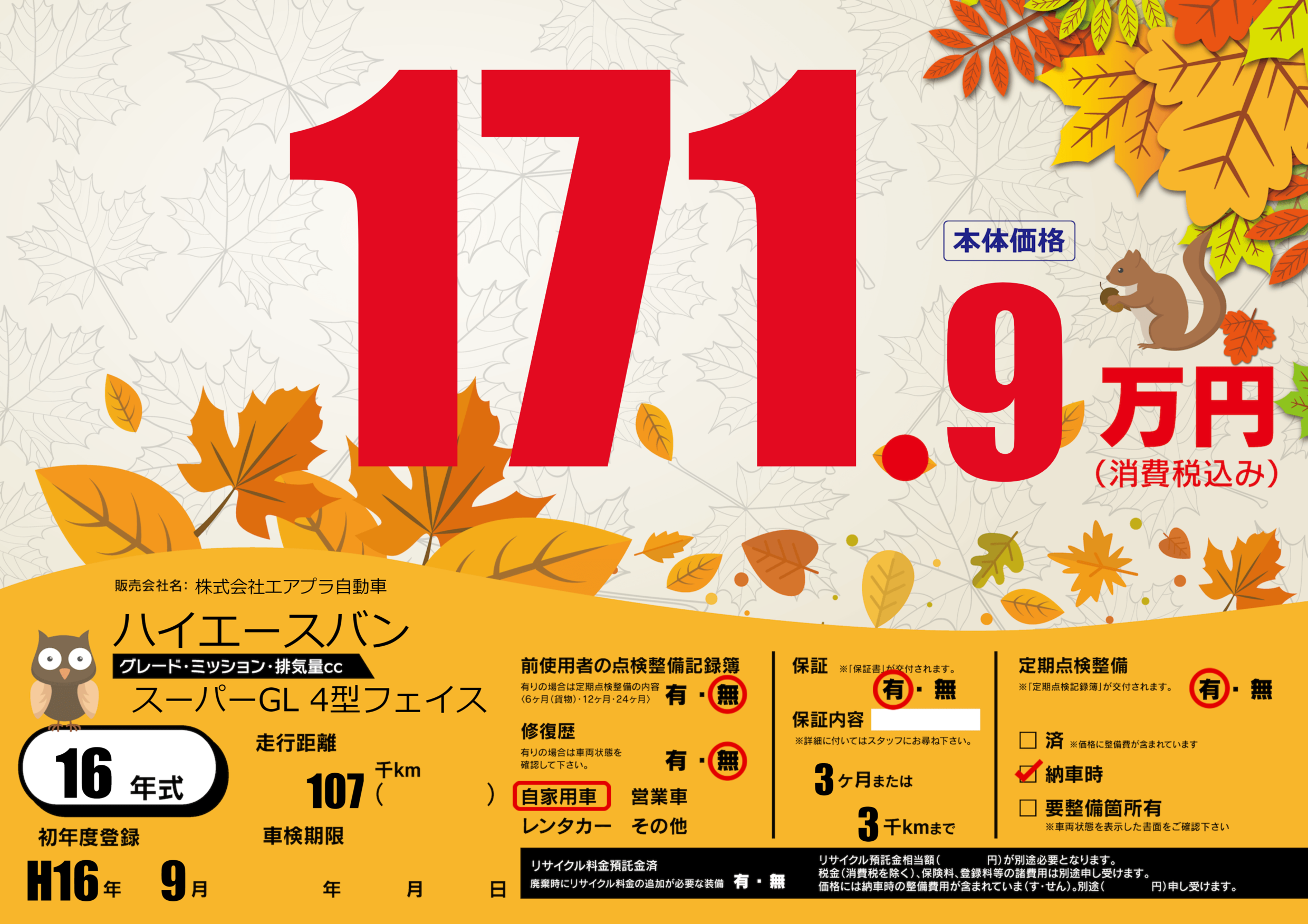 | 走行キロ | 10.7万km | 初年度登録 | H16年9月 |