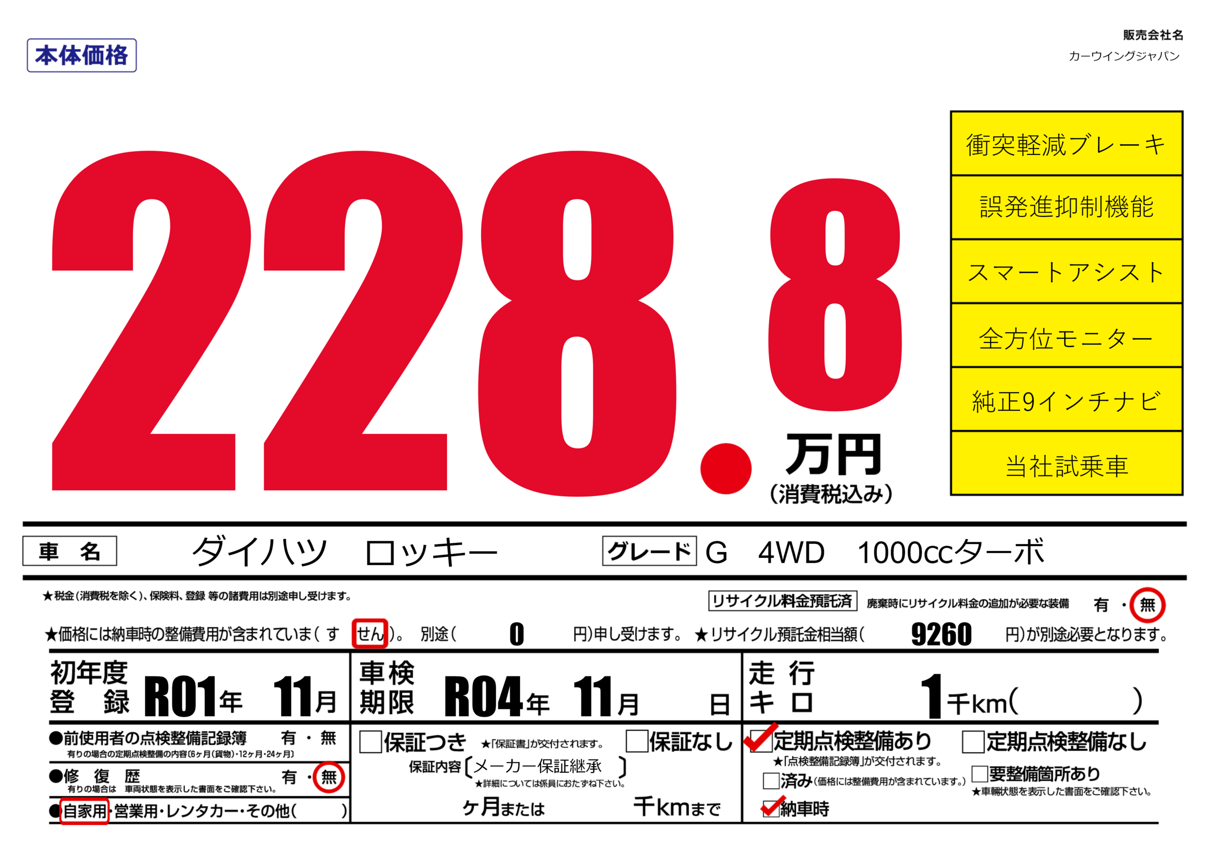 | 車名 | ダイハツ ロッキー | グレード ミッション 排気量 |