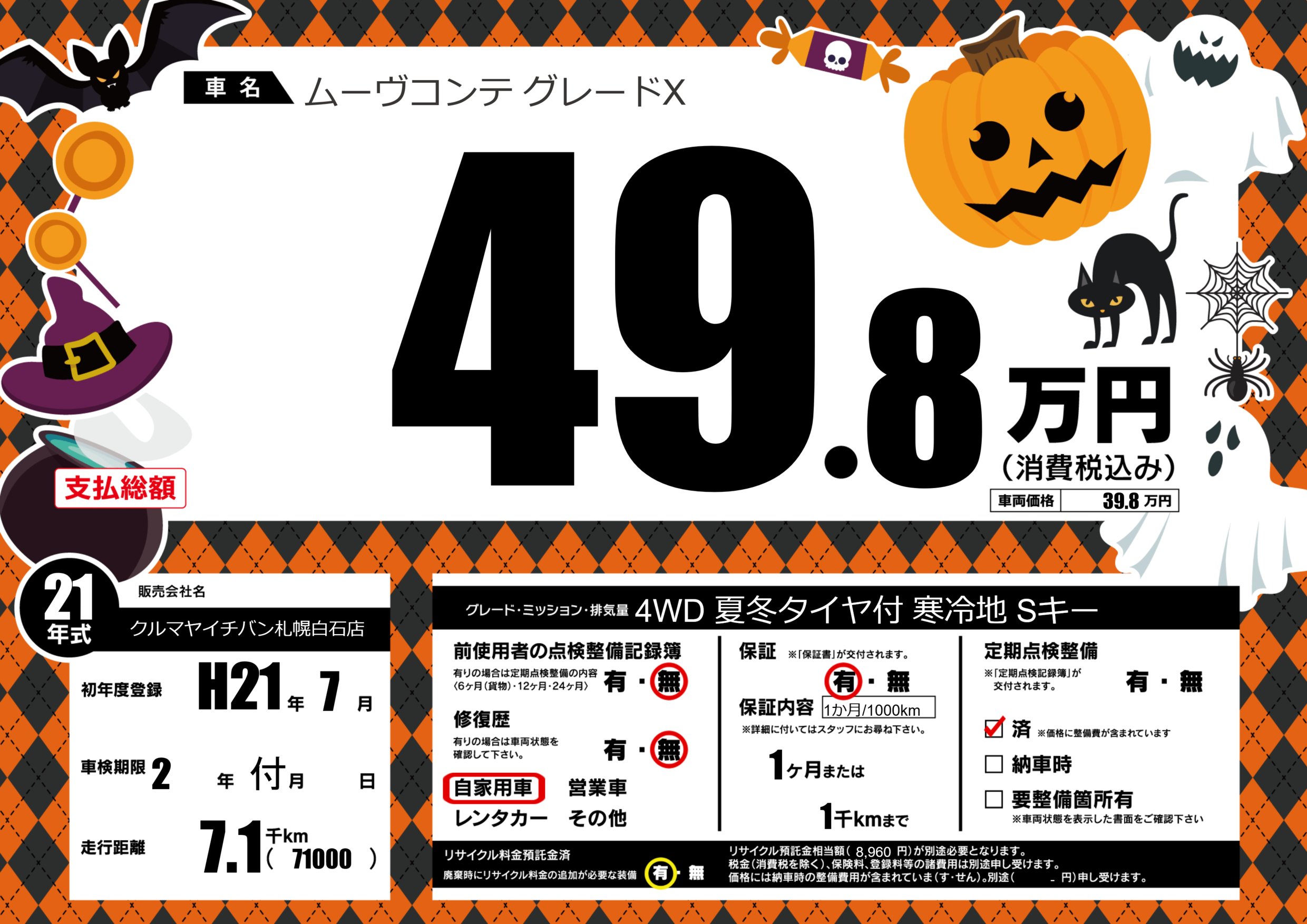 | 車名 | ムーヴコンテ グレードX | グレード ミッション 排気量 |