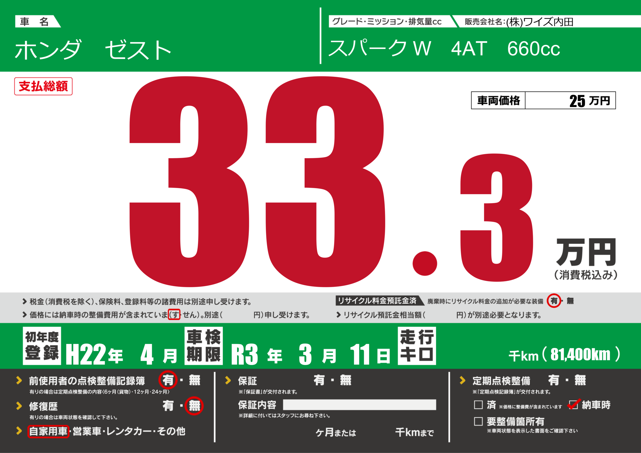 | 車名 | ホンダ ゼスト | グレード ミッション 排気量 |
