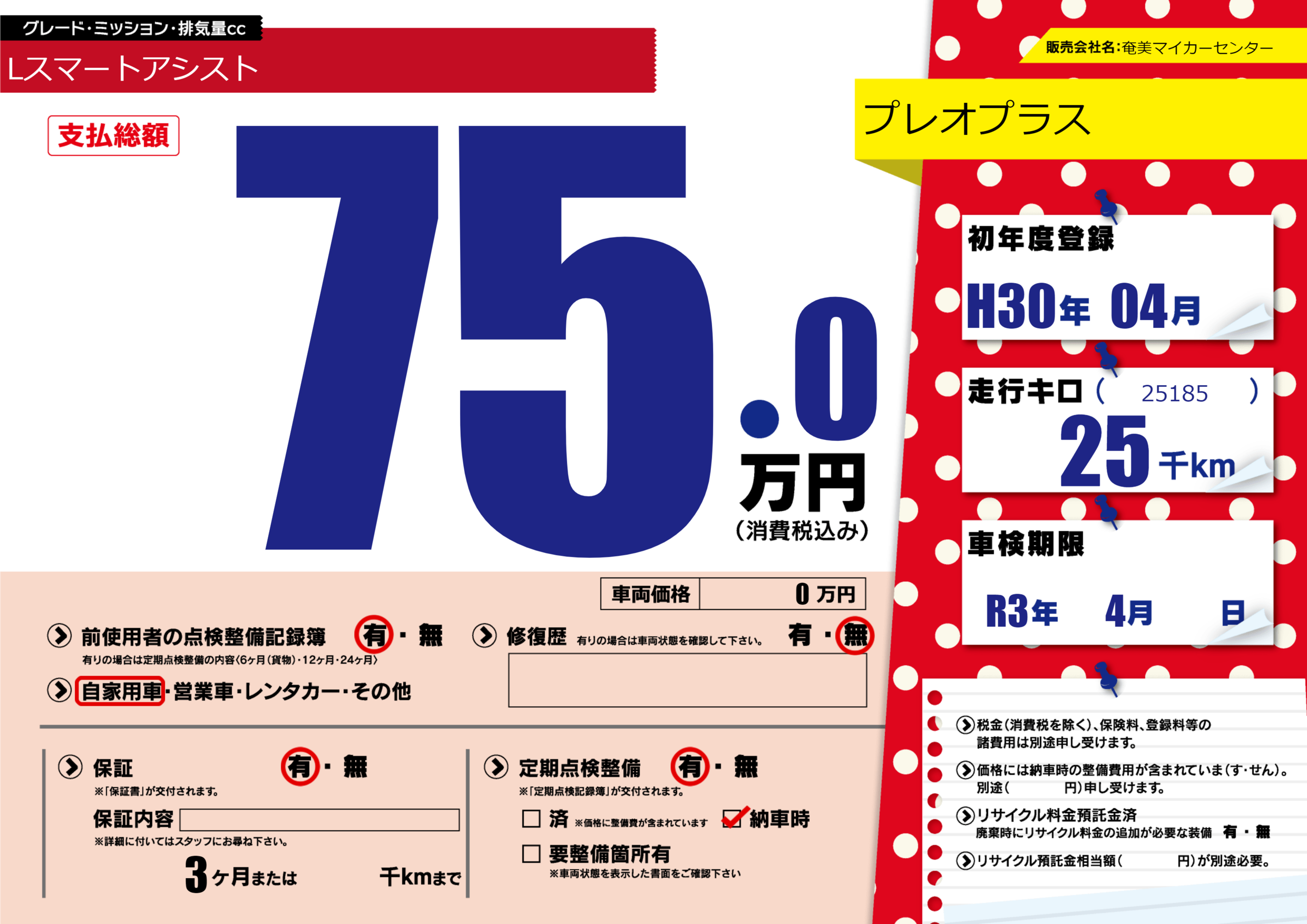 | 定期点検整備 | 定期点検整備あり 納車時あり | ||