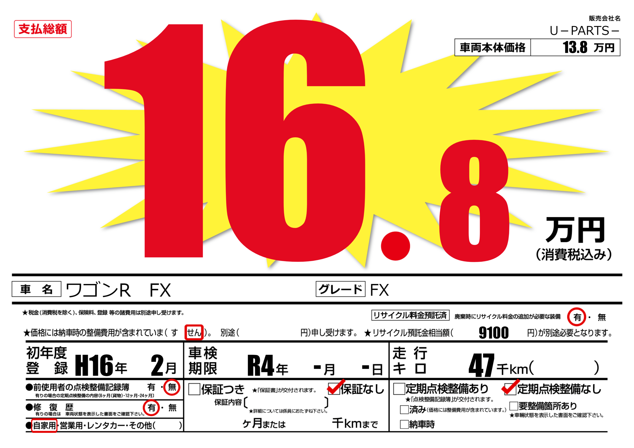 | 車名 | ワゴンR FX | グレード ミッション 排気量 |