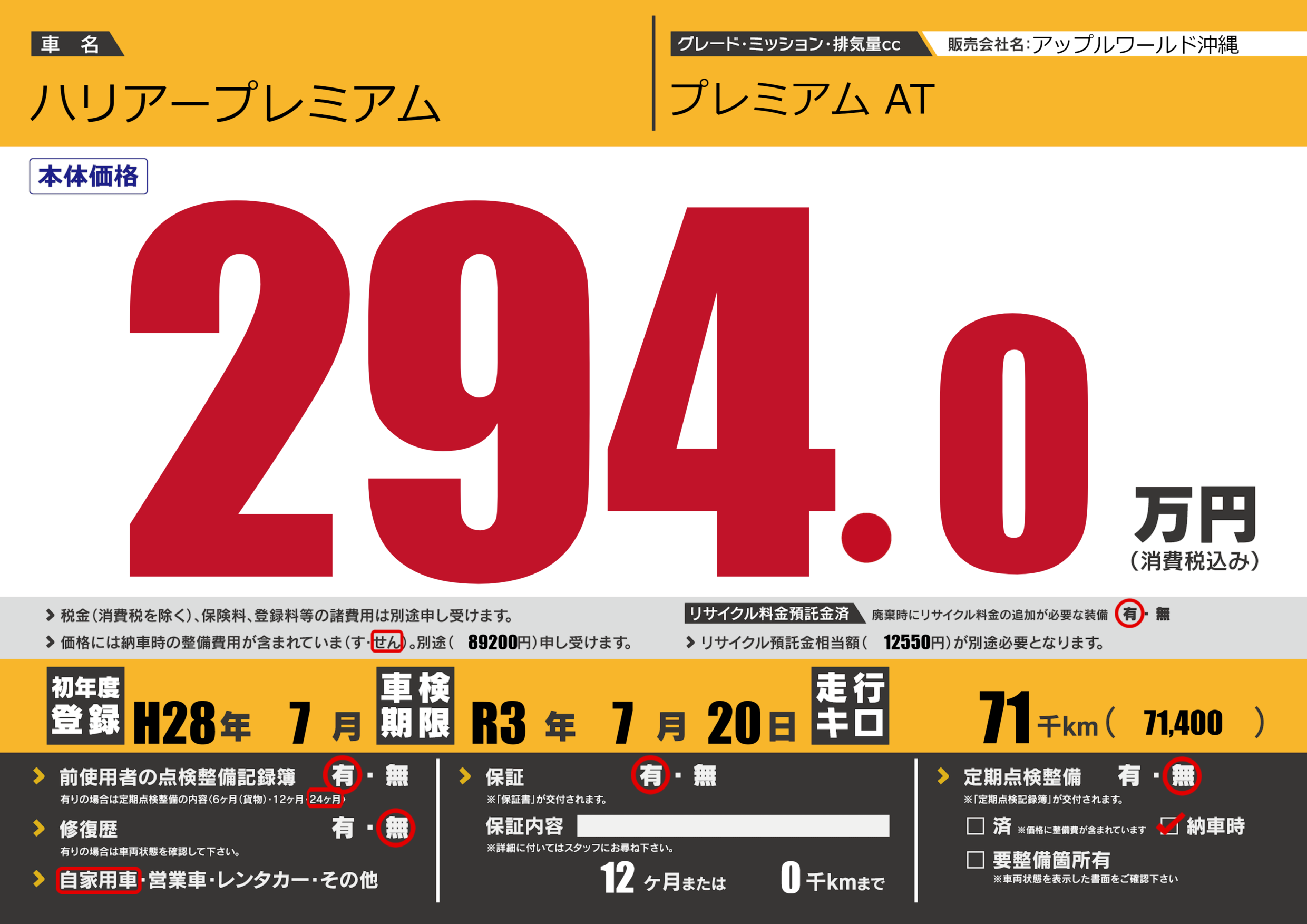 | 車名 | ハリアープレミアム | グレード ミッション 排気量 |