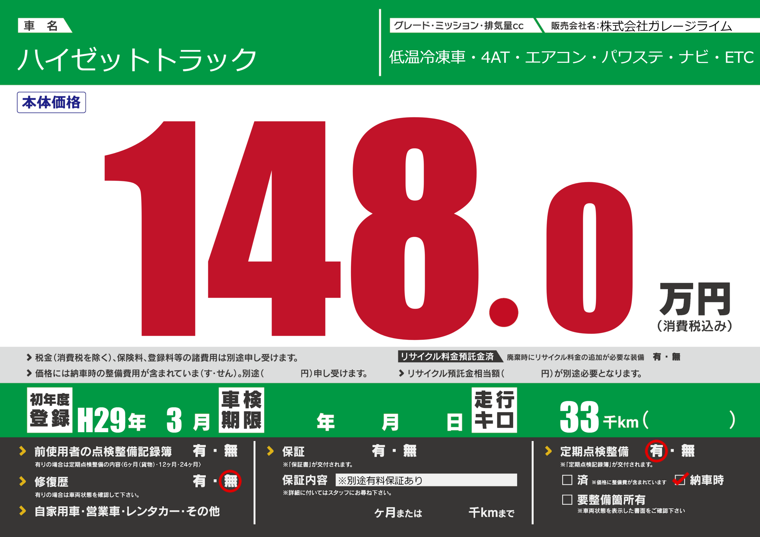 | 車名 | ハイゼットトラック | グレード ミッション 排気量 |