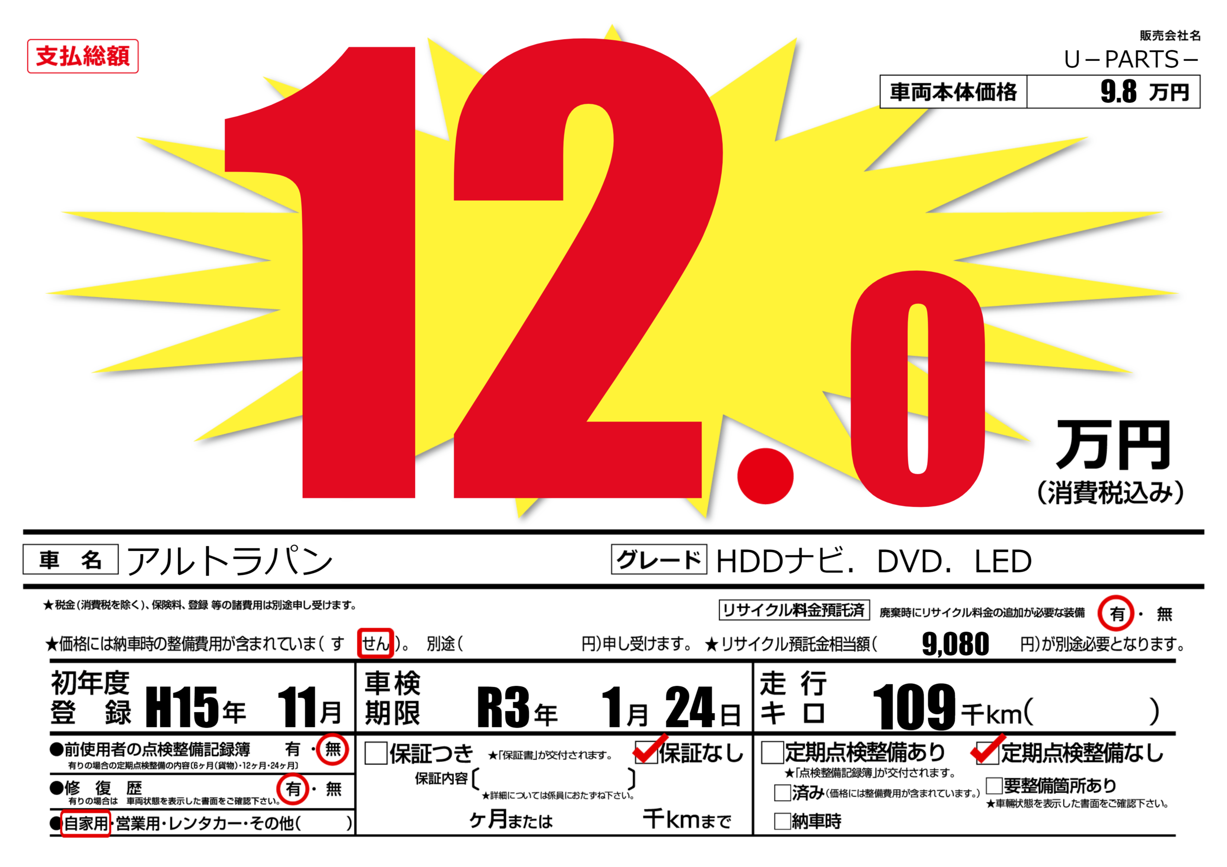 | 走行キロ | 10.9万km | 初年度登録 | H15年11月 |