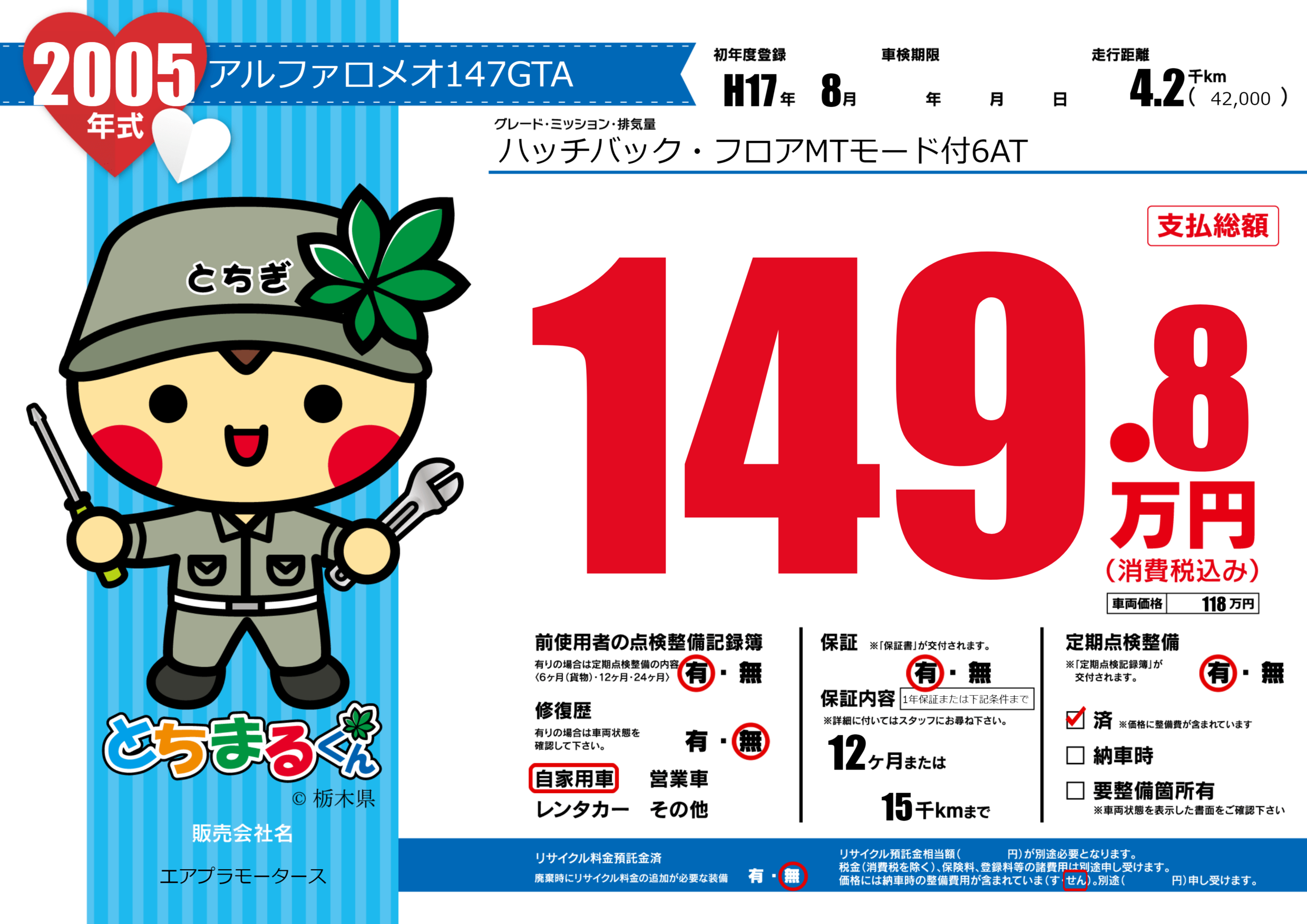 | 車名 | アルファロメオ147GTA | グレード ミッション 排気量 |