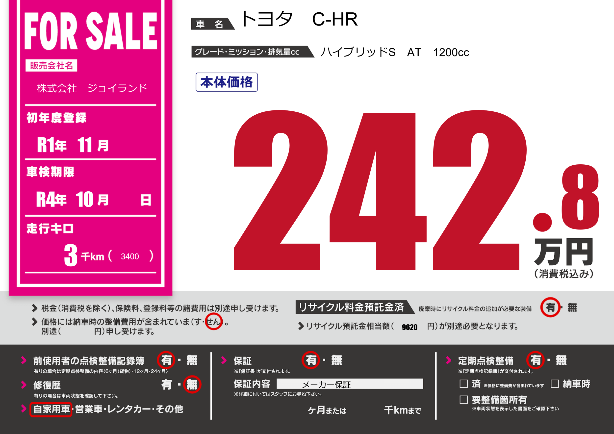 | 車名 | トヨタ C-HR | グレード ミッション 排気量 |