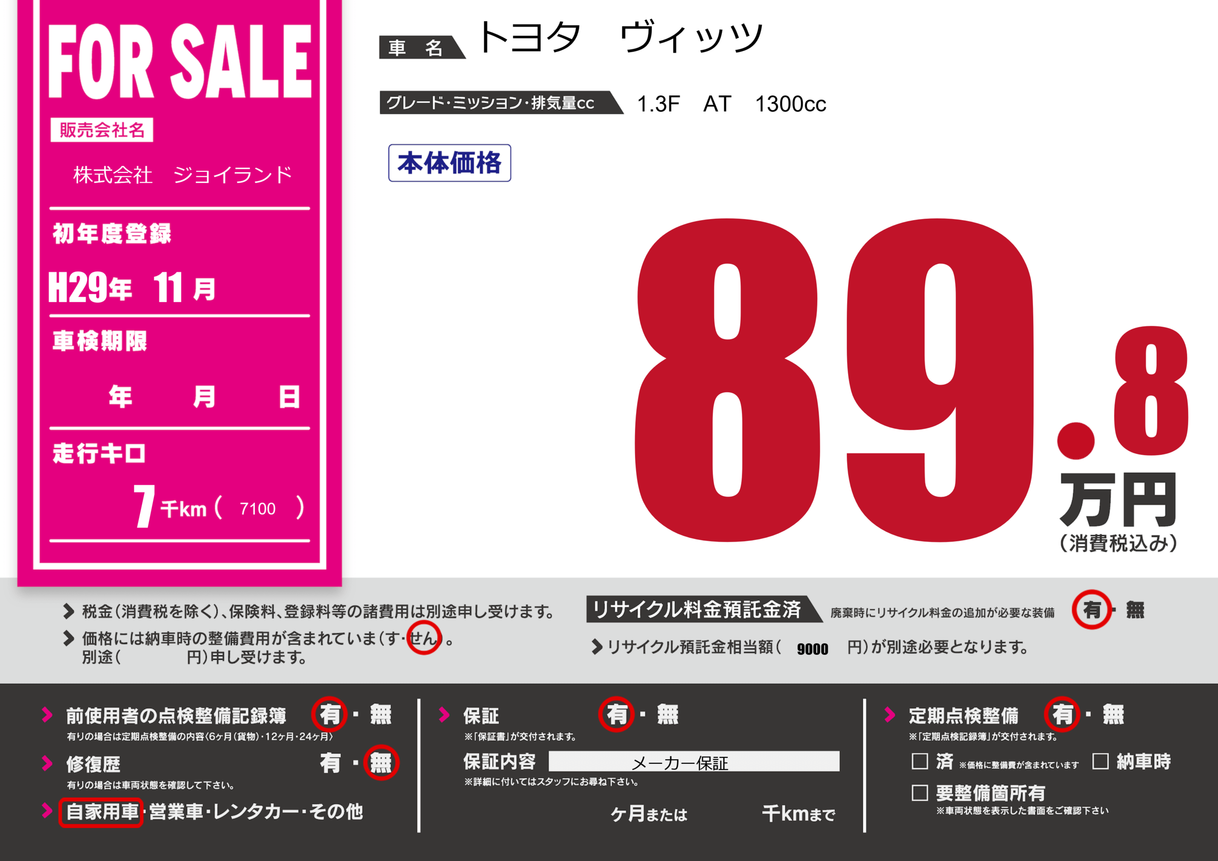 | 車名 | トヨタ ヴィッツ | グレード ミッション 排気量 |