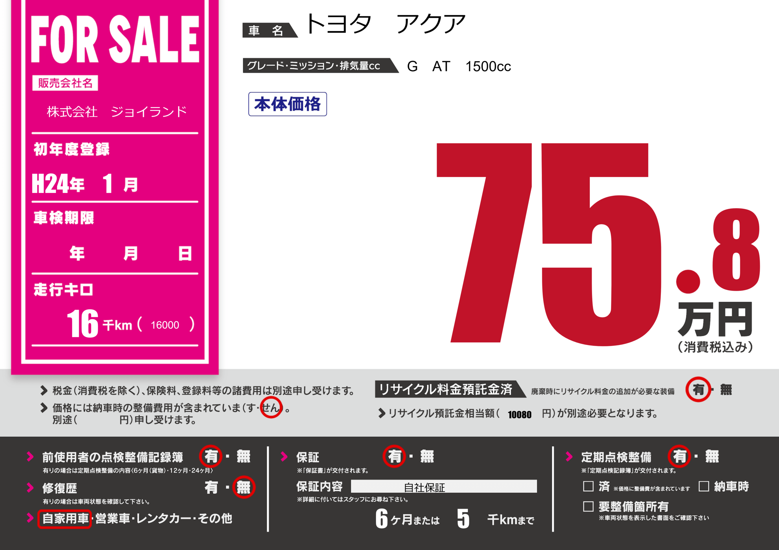 | 車名 | トヨタ アクア | グレード ミッション 排気量 |