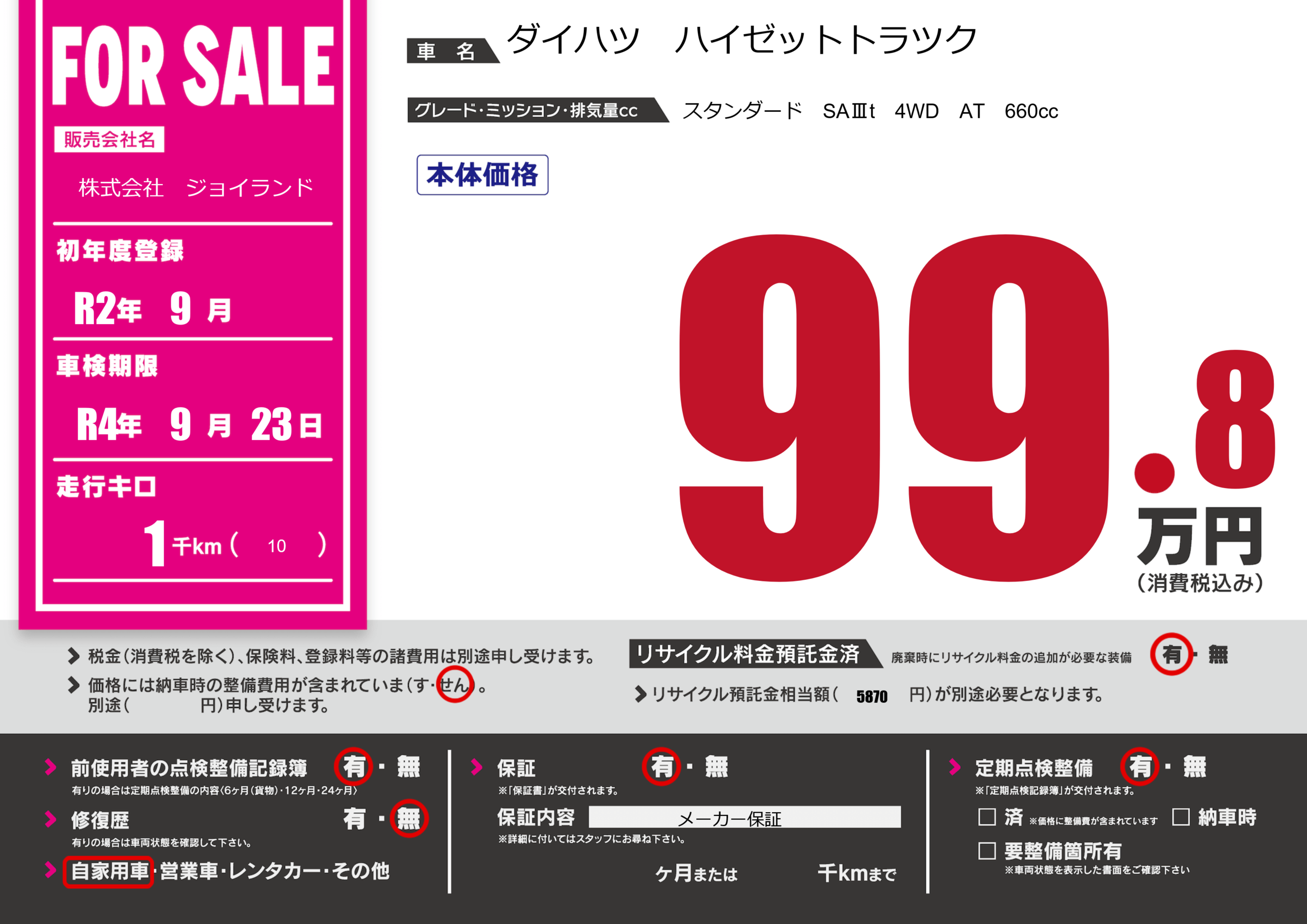 保証付き 保証内容( メーカー保証) ---ヶ月または()千kmまで |