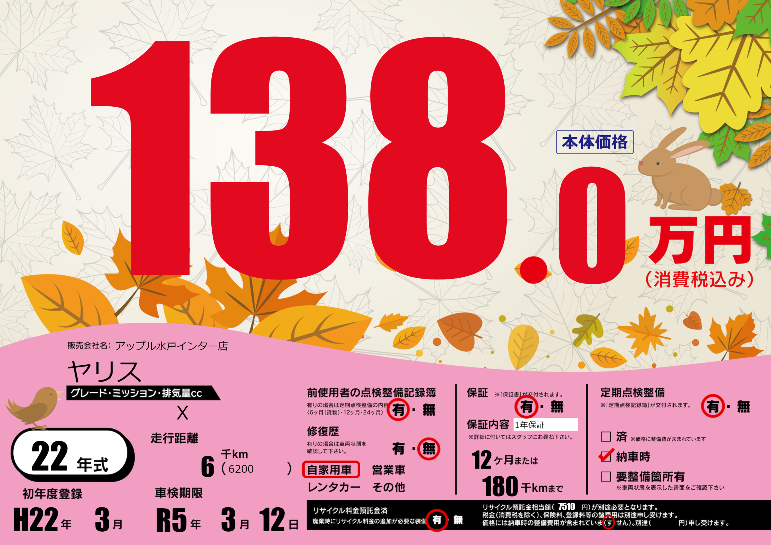| 走行キロ | 0.6万km | 初年度登録 | H22年3月 |