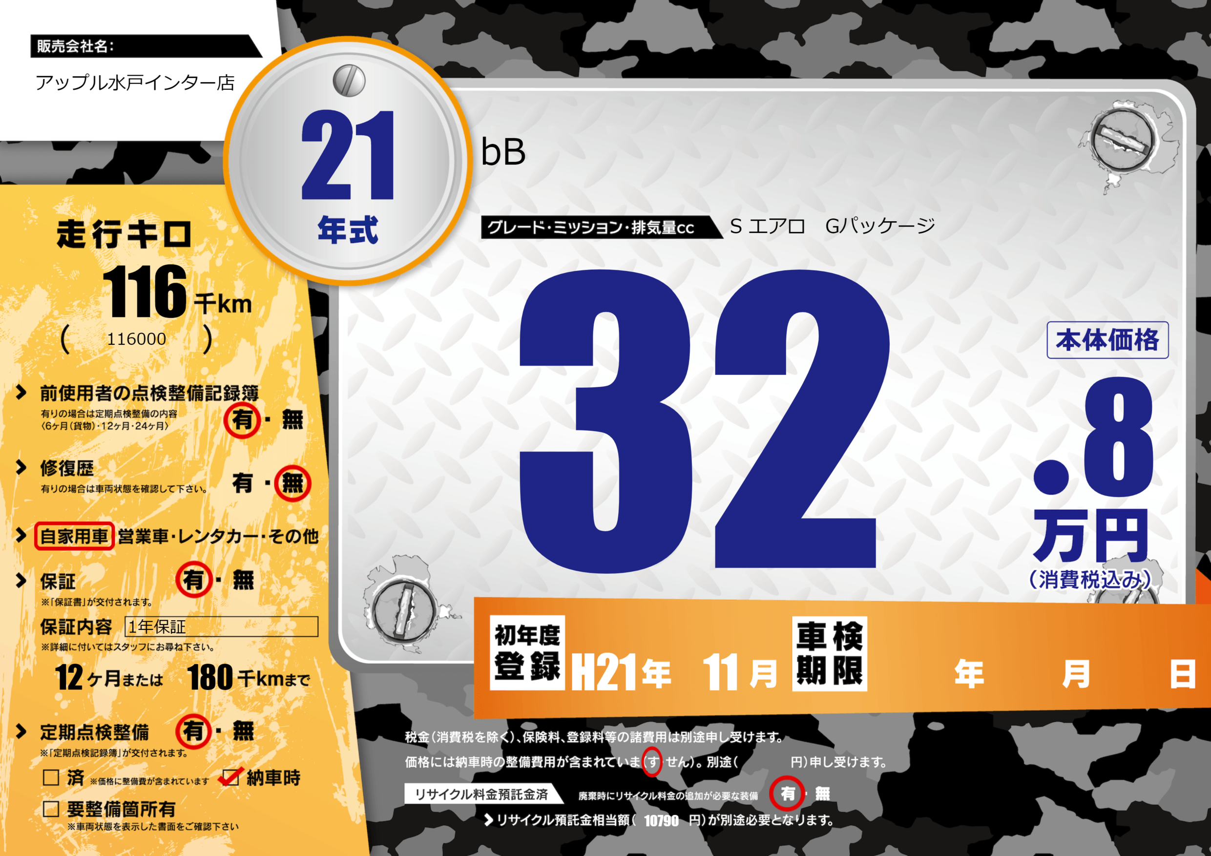 | 定期点検整備 | 定期点検整備あり 納車時あり | ||
