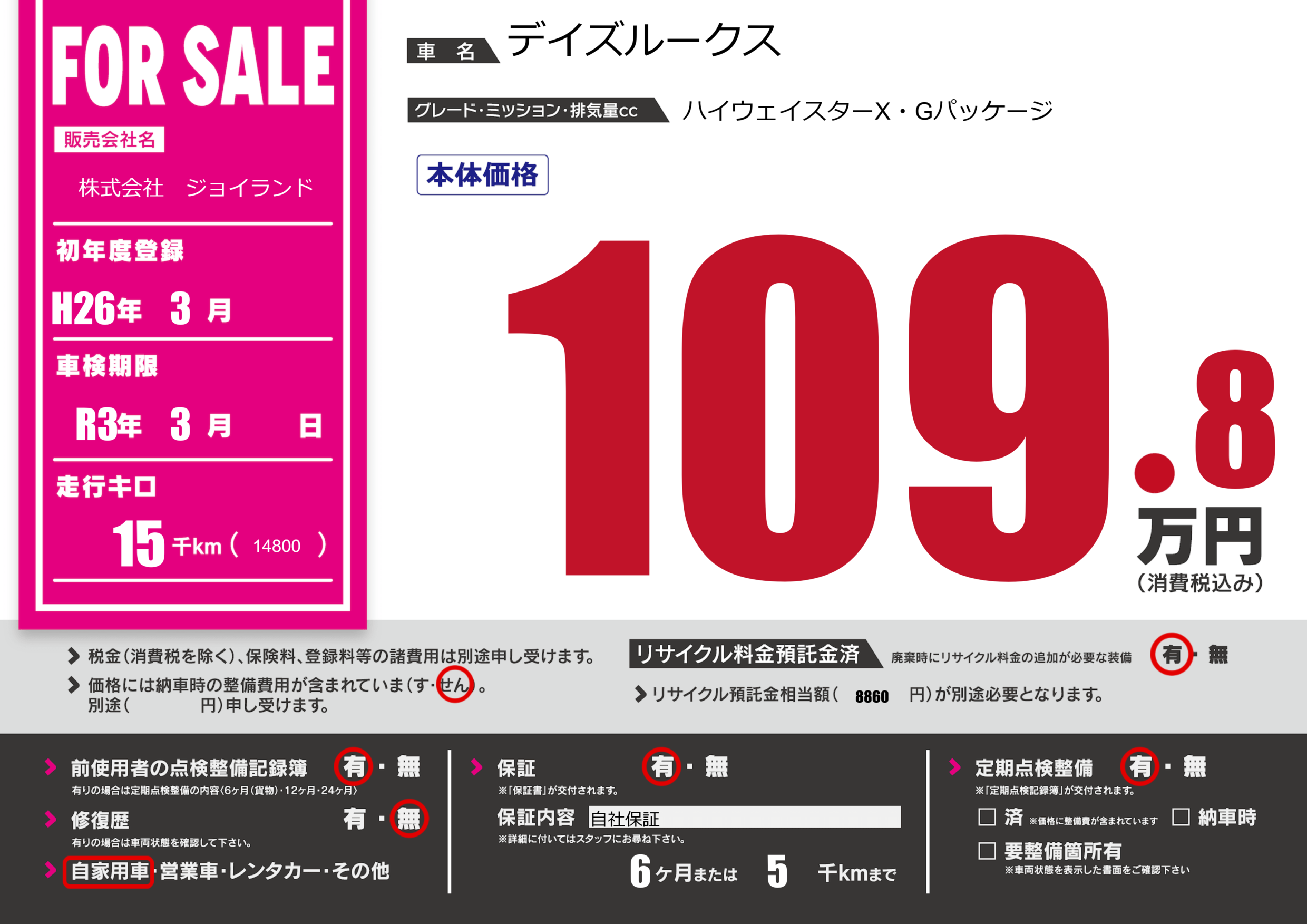 | 走行キロ | 1.5万km | 初年度登録 | H26年3月 |
