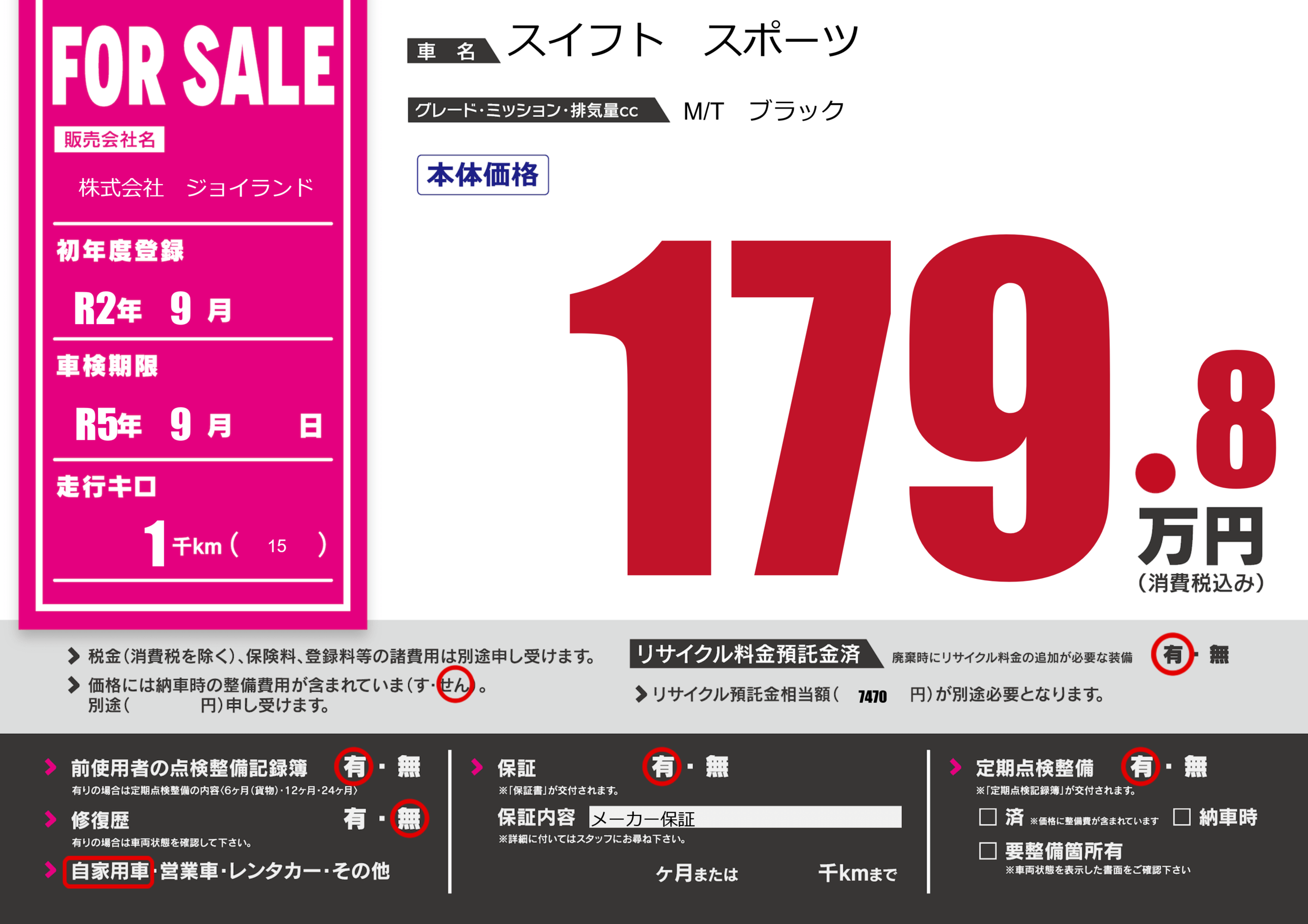 | 車名 | スイフト スポーツ | グレード ミッション 排気量 |