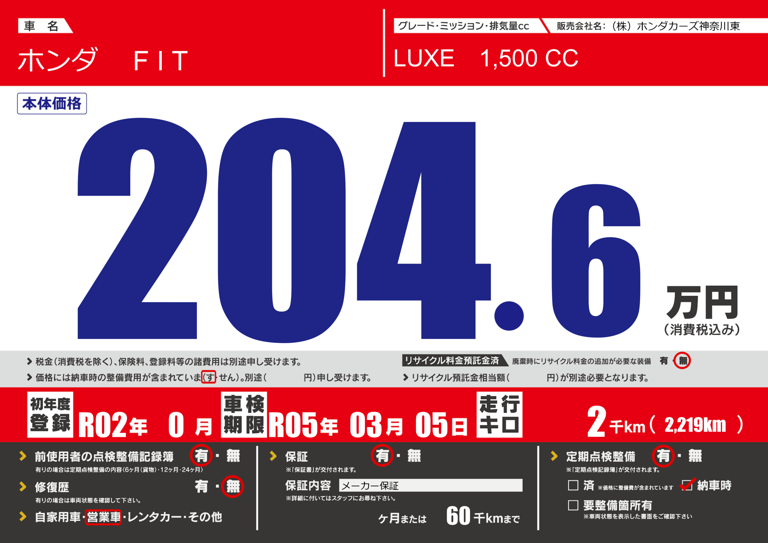 | 車検制限 | R05年 03月 05日 | ||