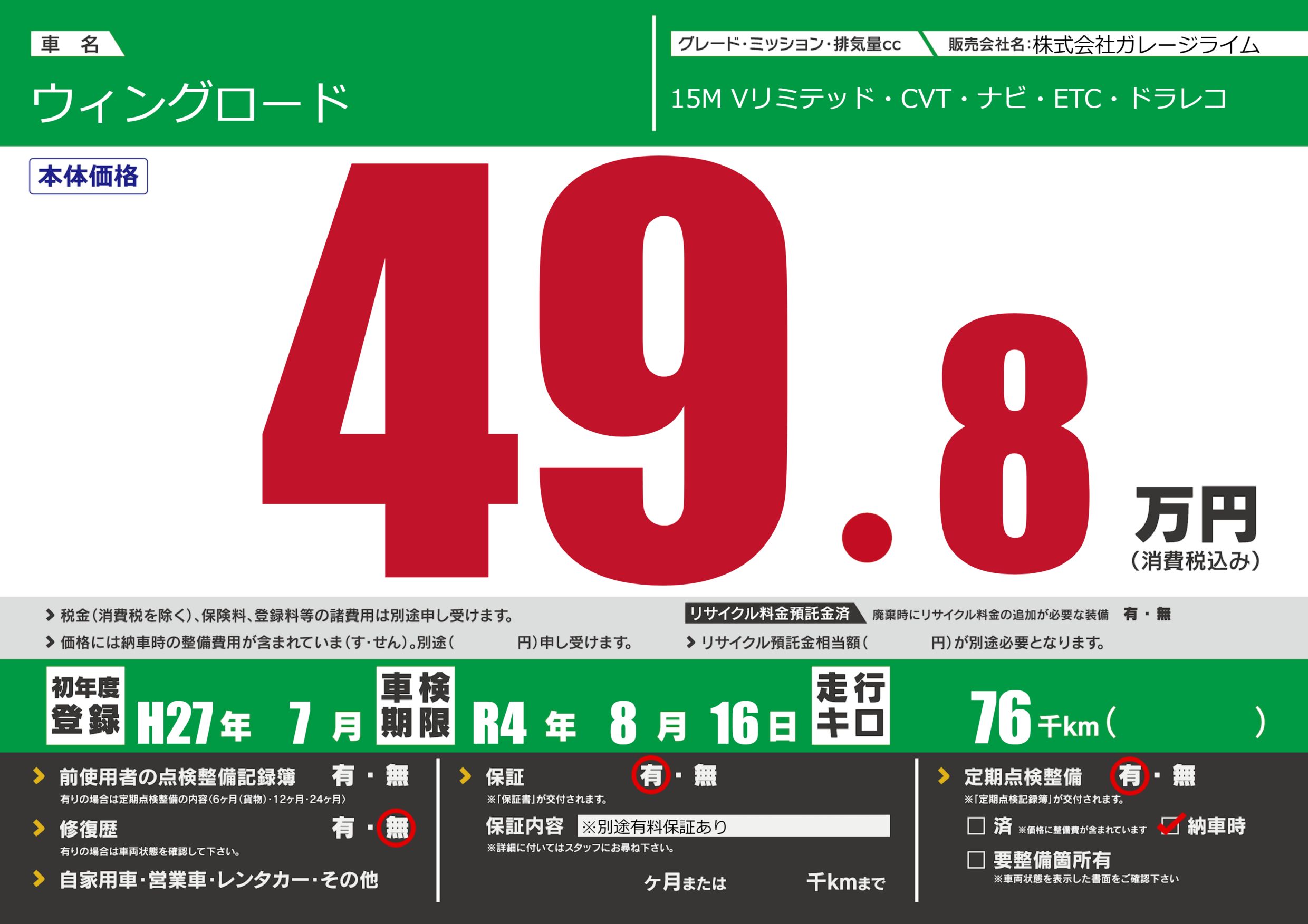 | 車名 | ウィングロード | グレード ミッション 排気量 |