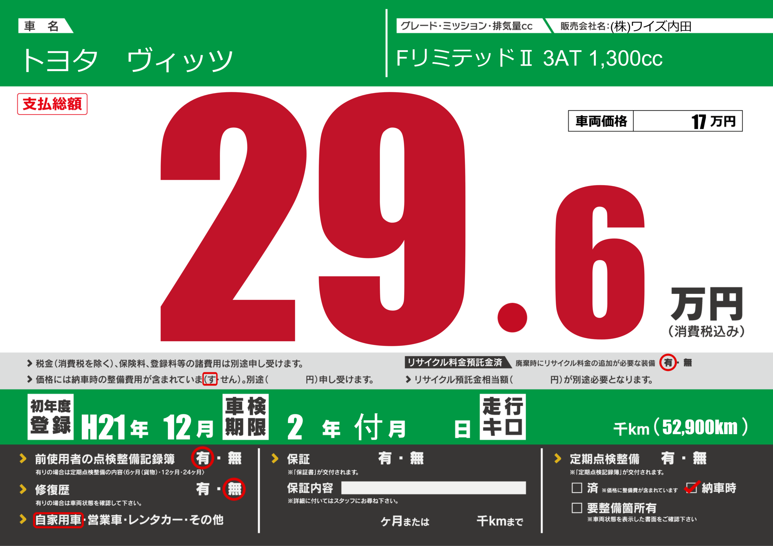 | 車名 | トヨタ ヴィッツ | グレード ミッション 排気量 |