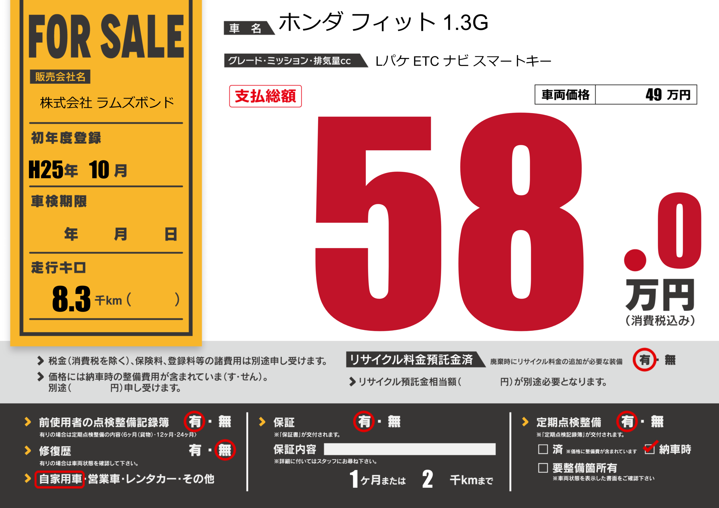 | 車名 | ホンダ フィット 1.3G | グレード ミッション 排気量 |