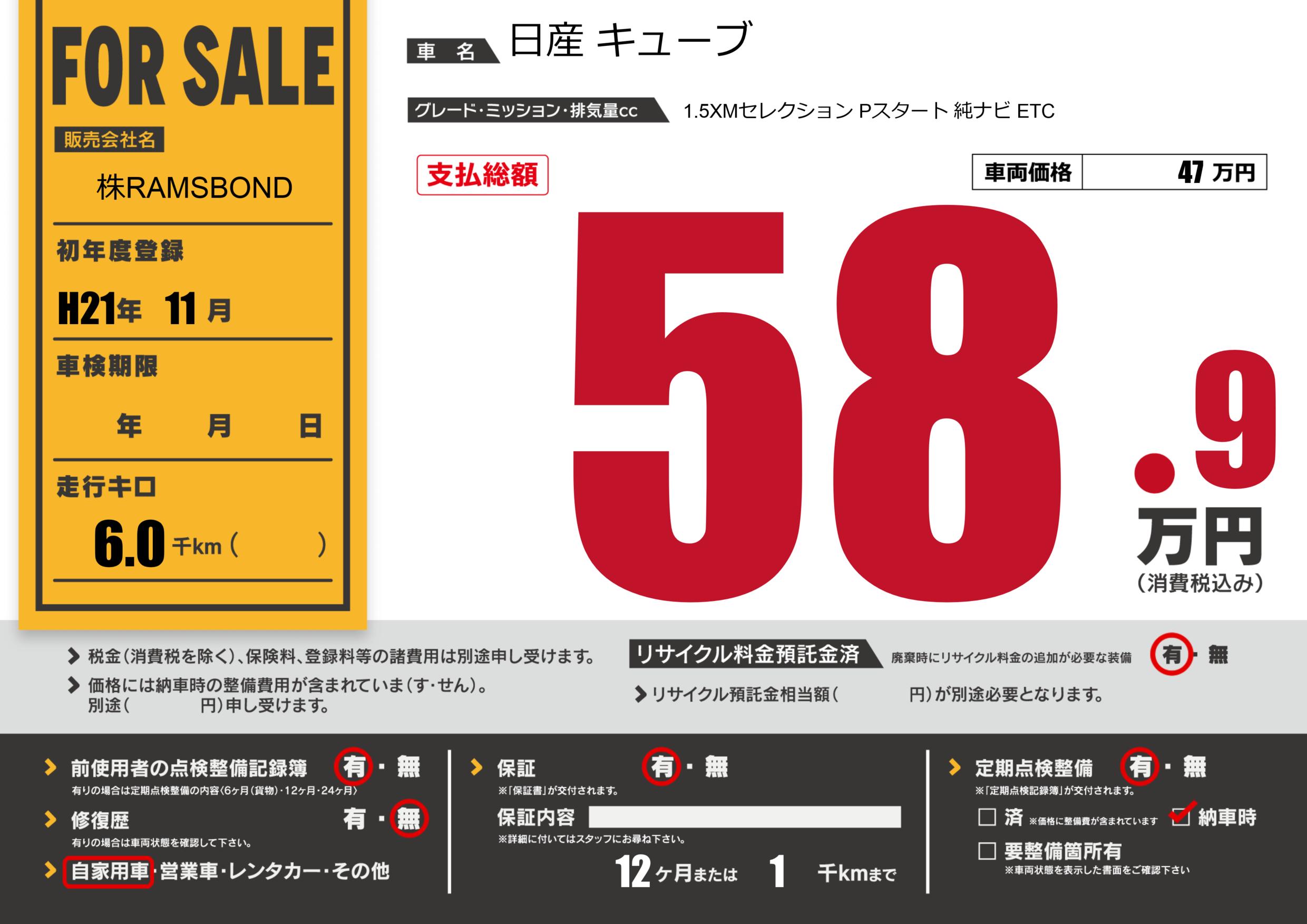 | 車名 | 日産 キューブ | グレード ミッション 排気量 |