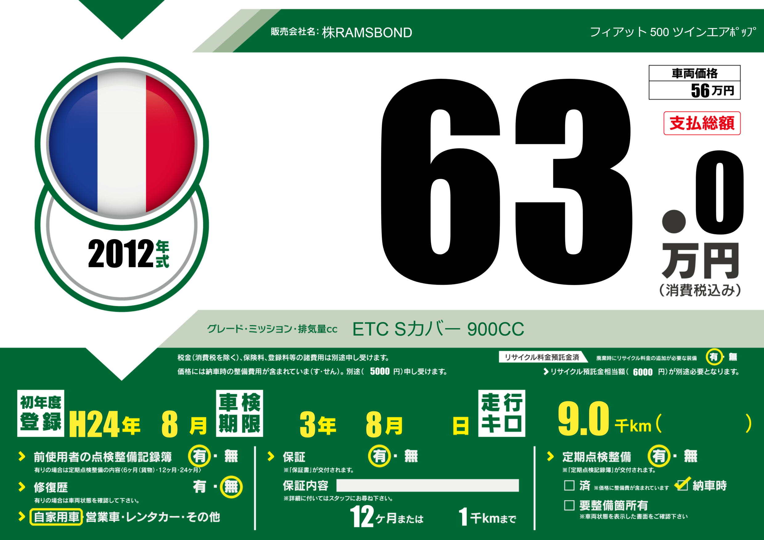 | 車名 | フィアット 500 ツインエアポップ | グレード ミッション 排気量 |