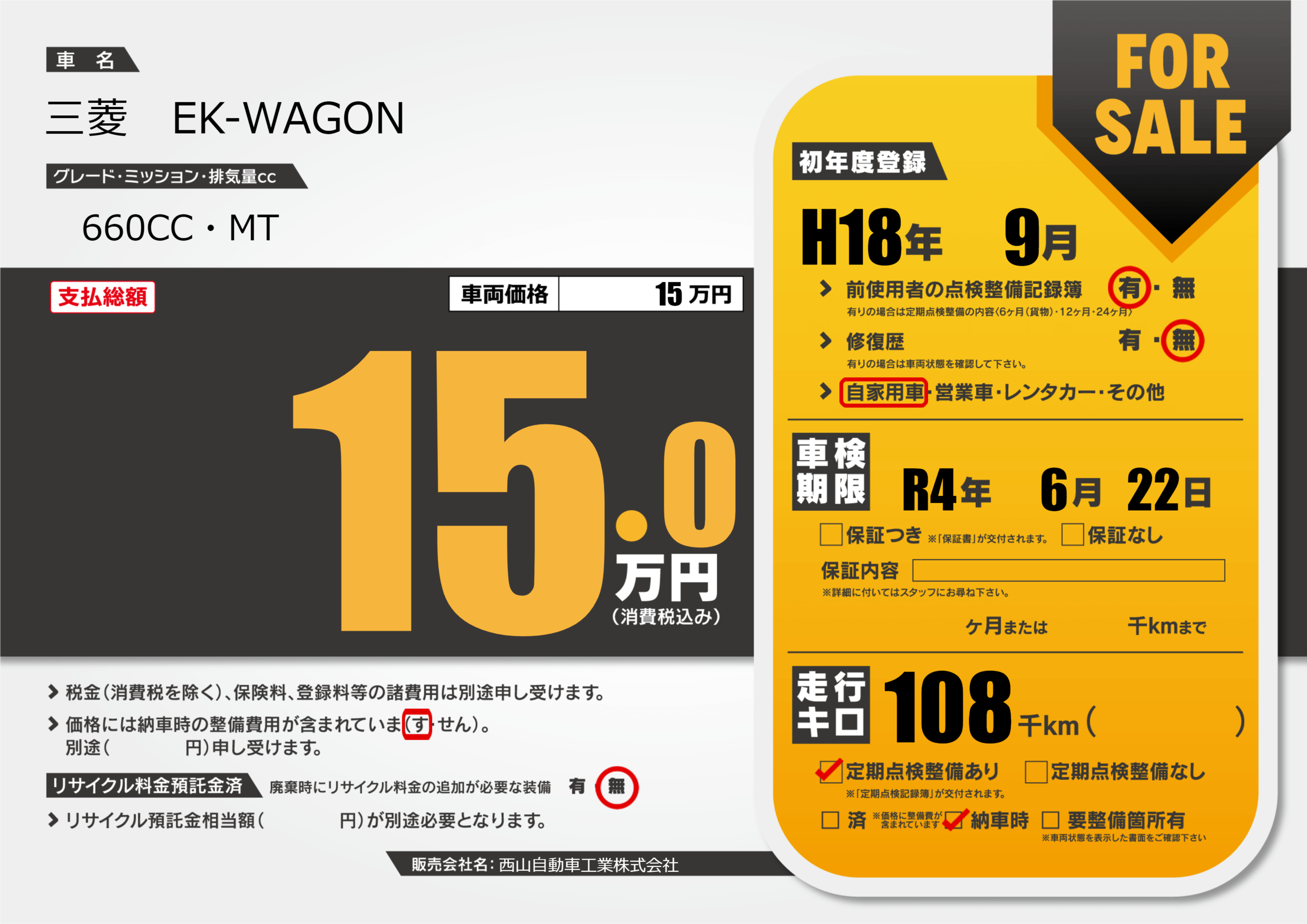 | 走行キロ | 10.8万km | 初年度登録 | H18年9月 |