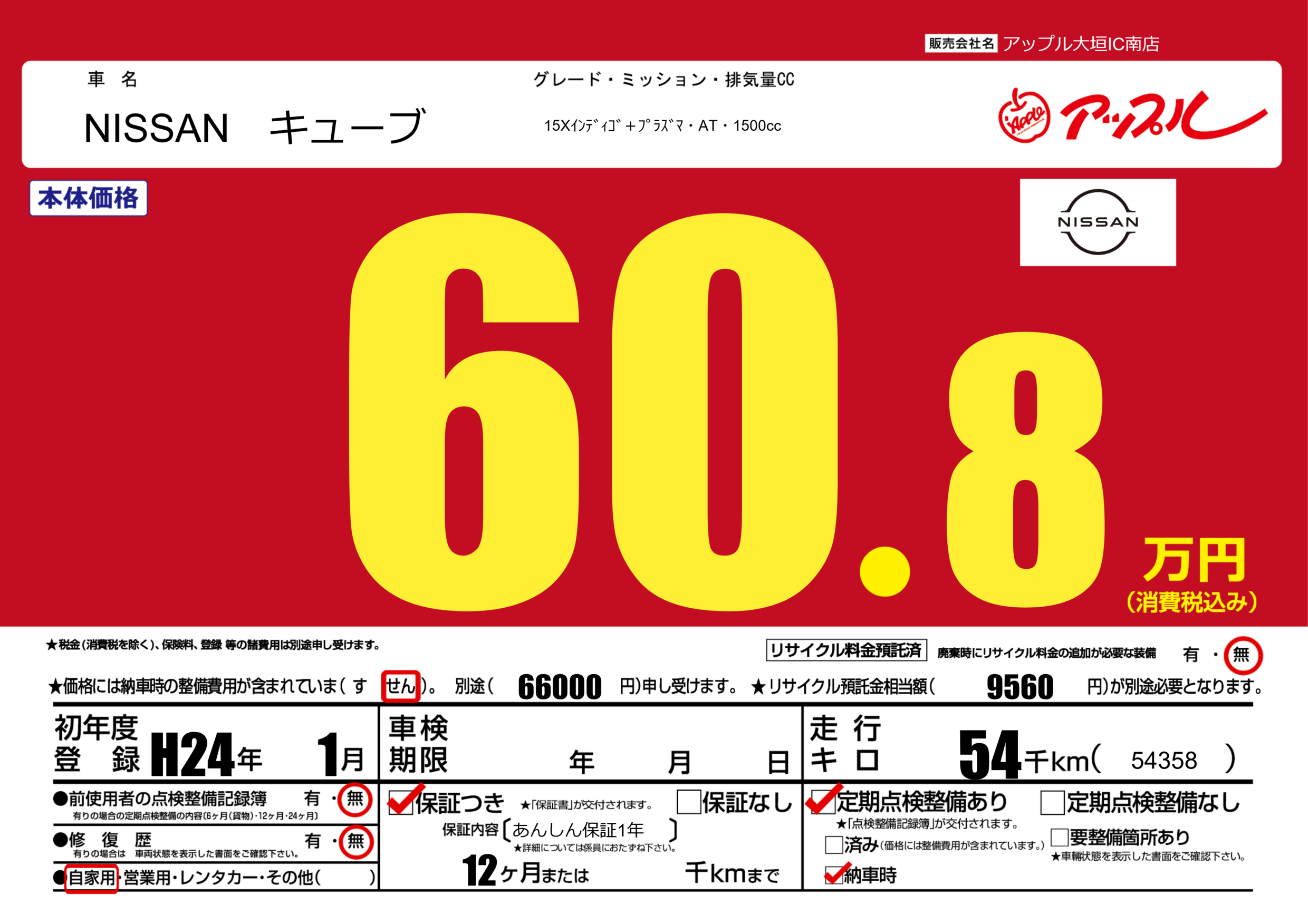 保証付き 保証内容(あんしん保証1年) 12ヶ月または()千kmまで |