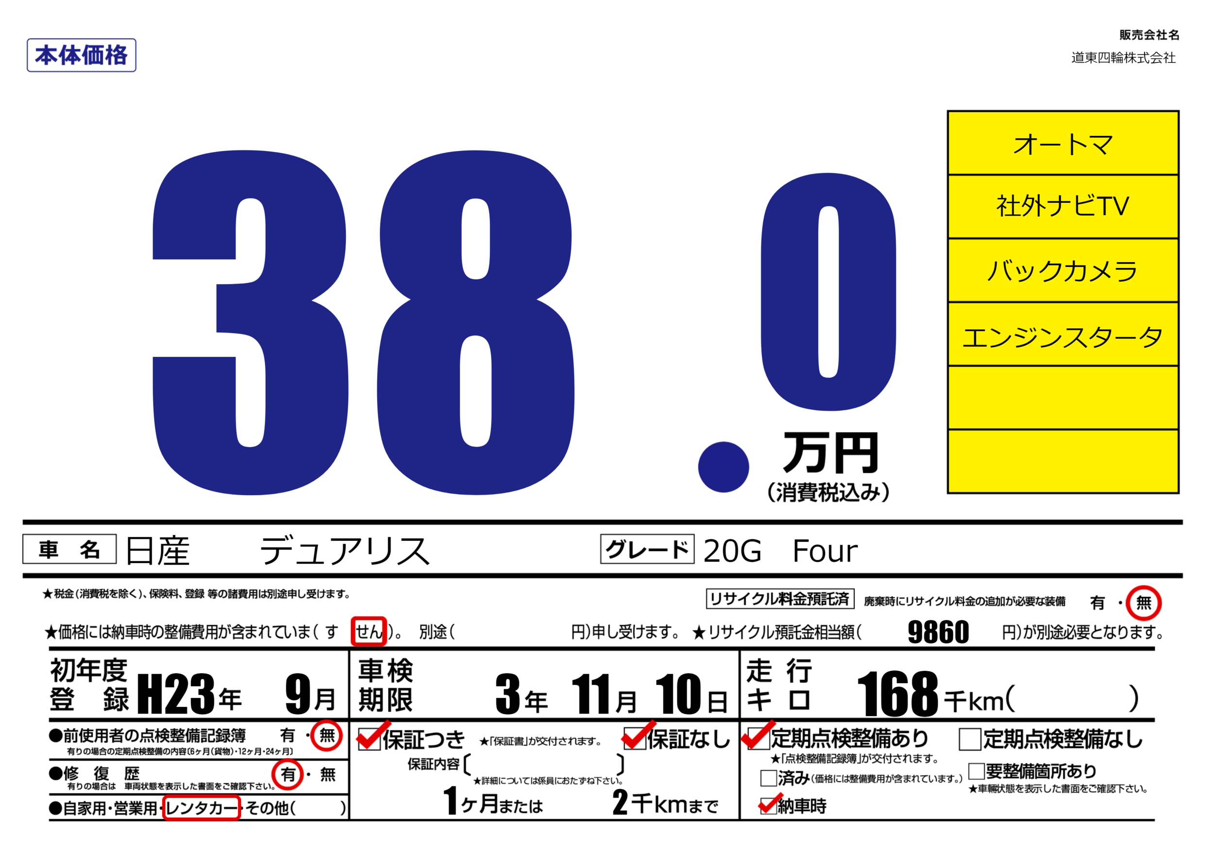 | 定期点検整備 | 定期点検整備あり 納車時あり | ||