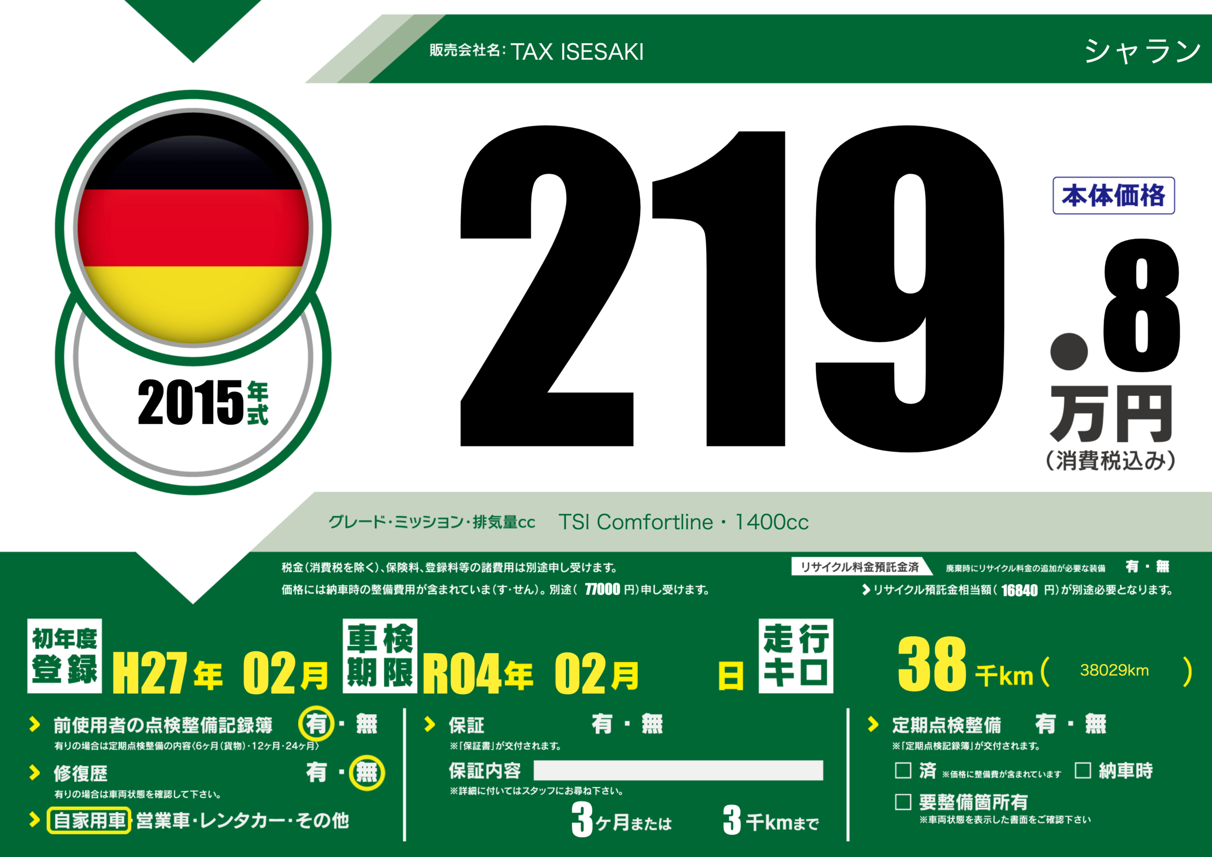 | 車名 | シャラン | グレード ミッション 排気量 |