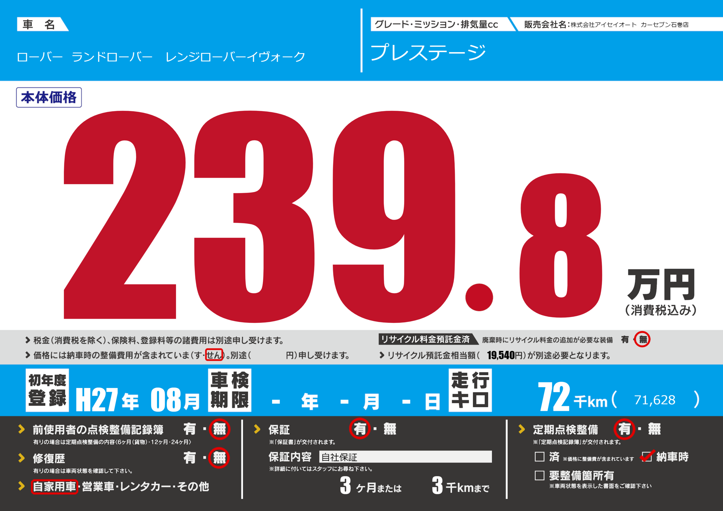 | 車名 | ローバー ランドローバー レンジローバーイヴォーク | グレード ミッション 排気量 |