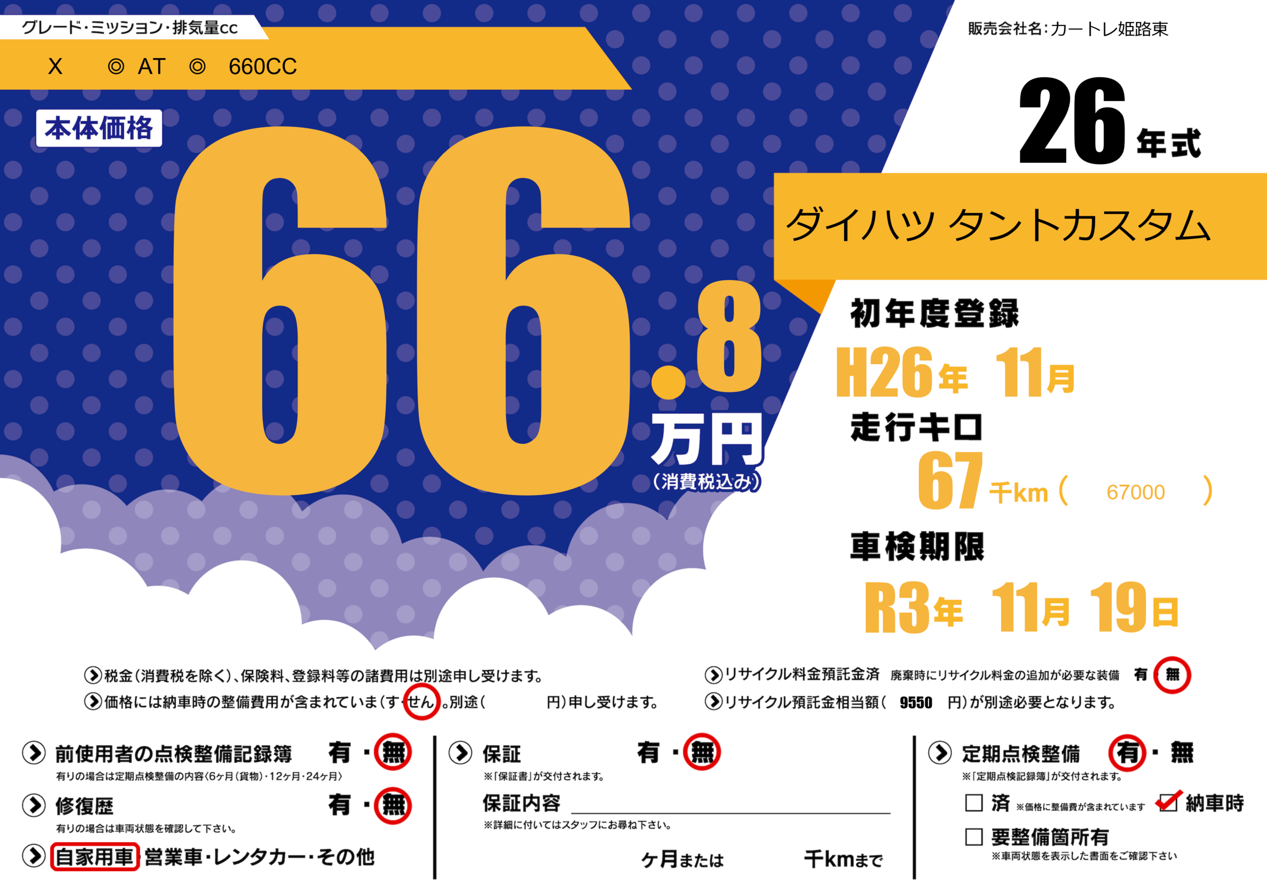 | 車名 | ダイハツ タントカスタム | グレード ミッション 排気量 |