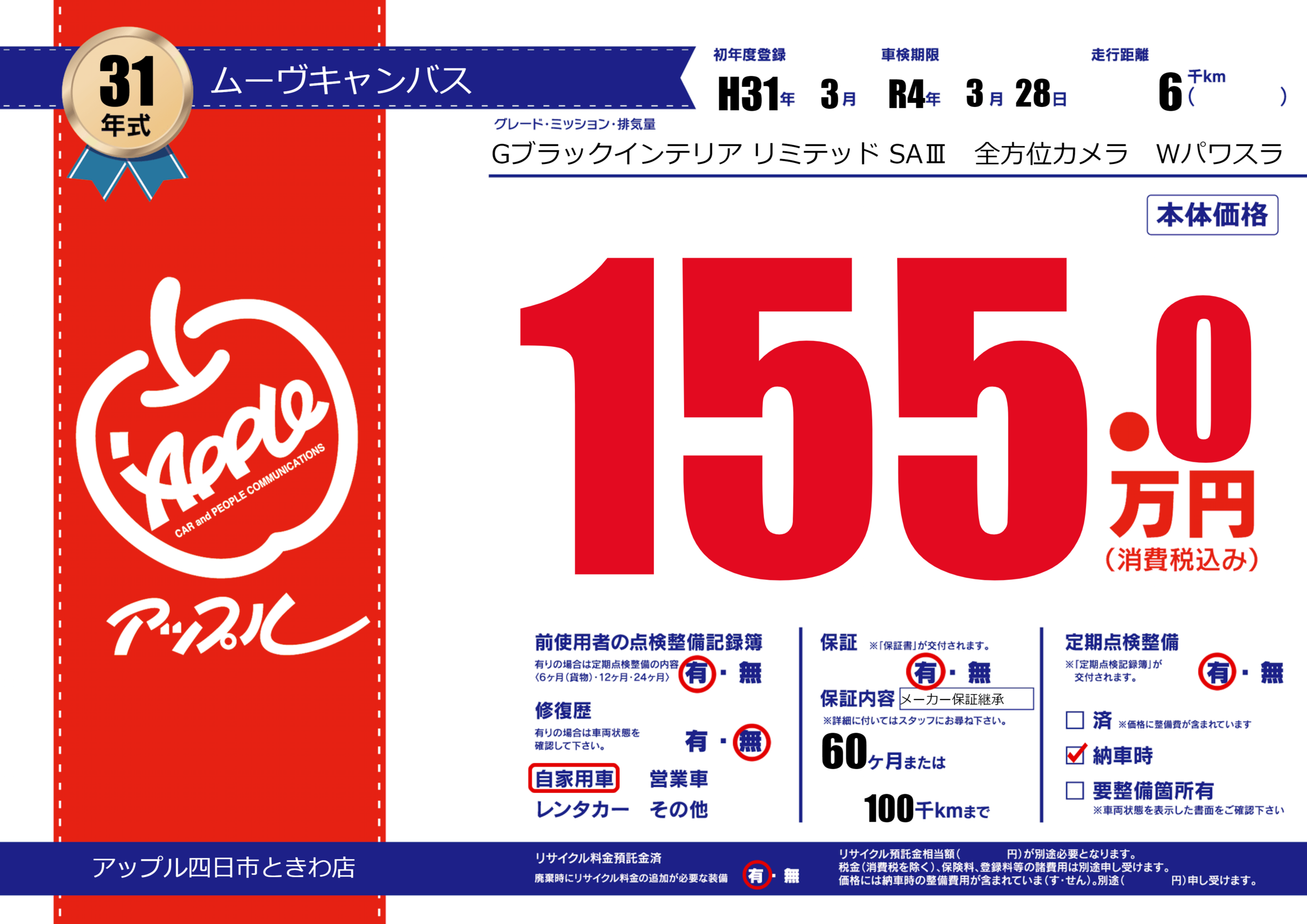 | 走行キロ | 0.6万km | 初年度登録 | H31年3月 |
