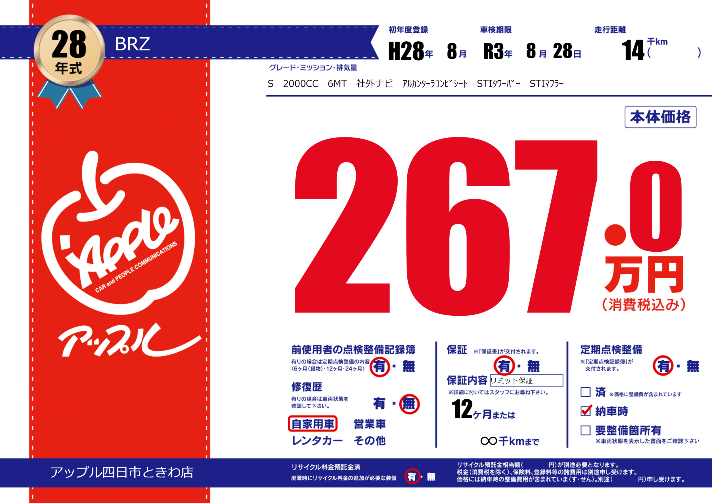 | 車名 | BRZ | グレード ミッション 排気量 |