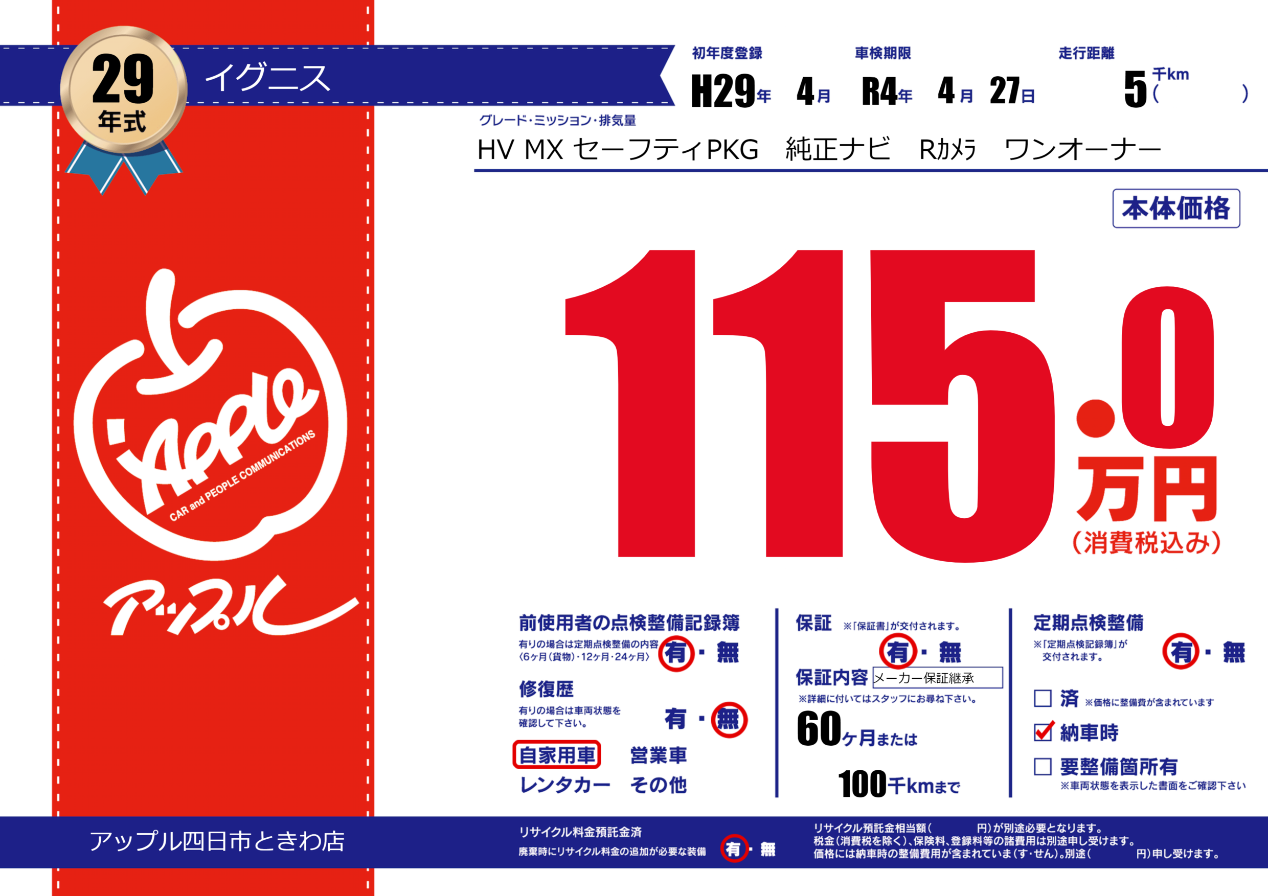保証付き 保証内容(メーカー保証継承) 60ヶ月または(100)千kmまで |