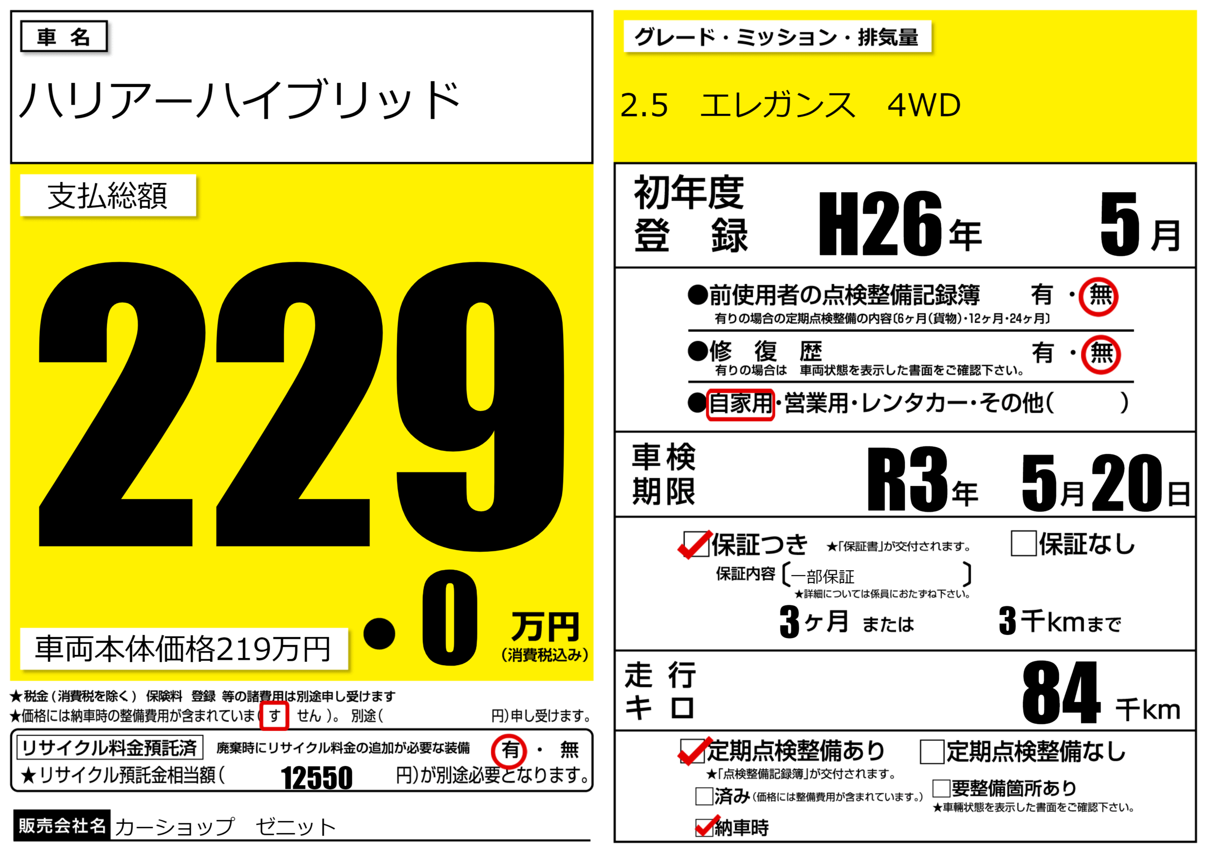 | 車名 | ハリアーハイブリッド | グレード ミッション 排気量 |