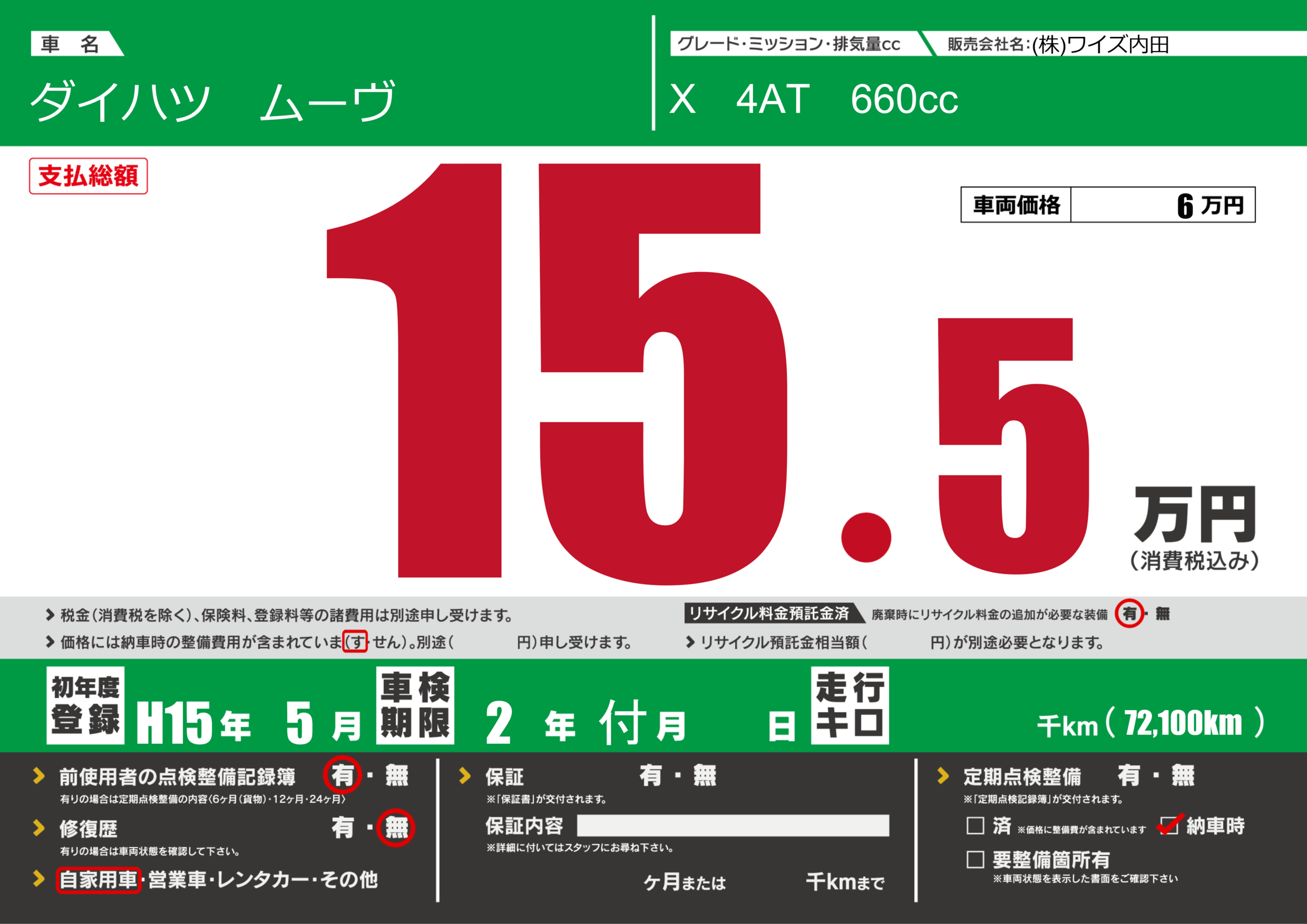 | 車名 | ダイハツ ムーヴ | グレード ミッション 排気量 |
