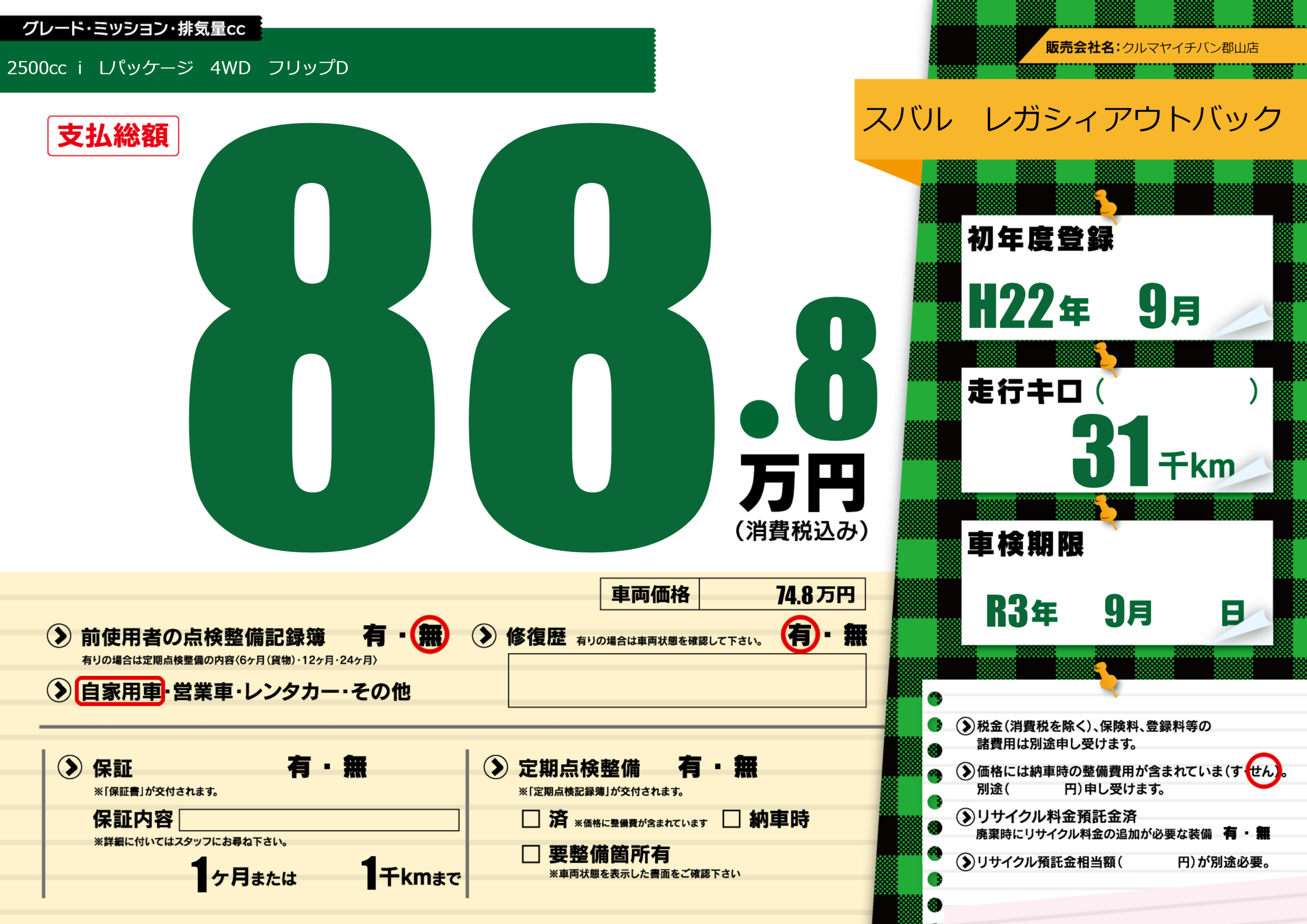 | 車名 | スバル レガシィアウトバック | グレード ミッション 排気量 |