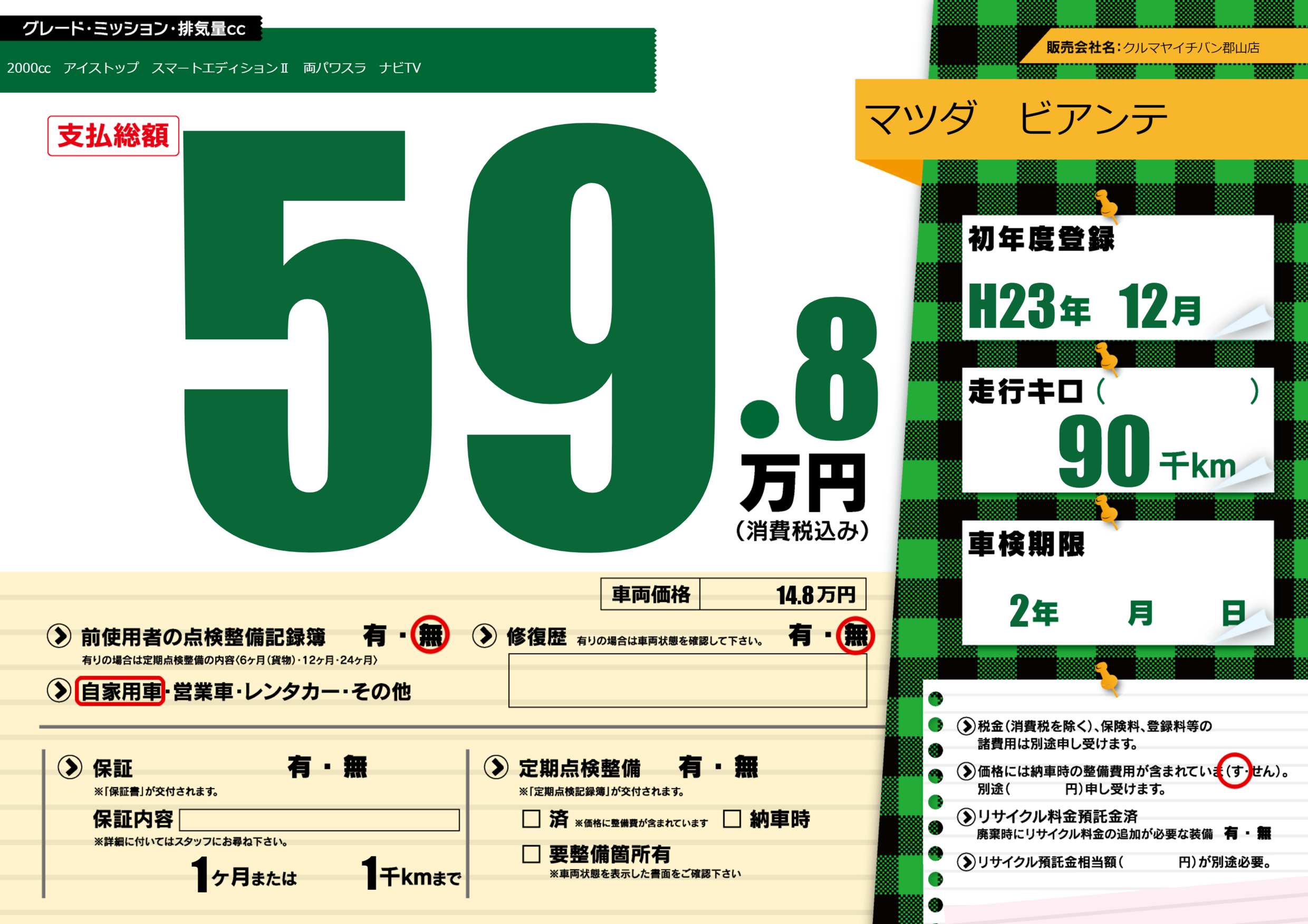 | 走行キロ | 9万km | 初年度登録 | H23年12月 |